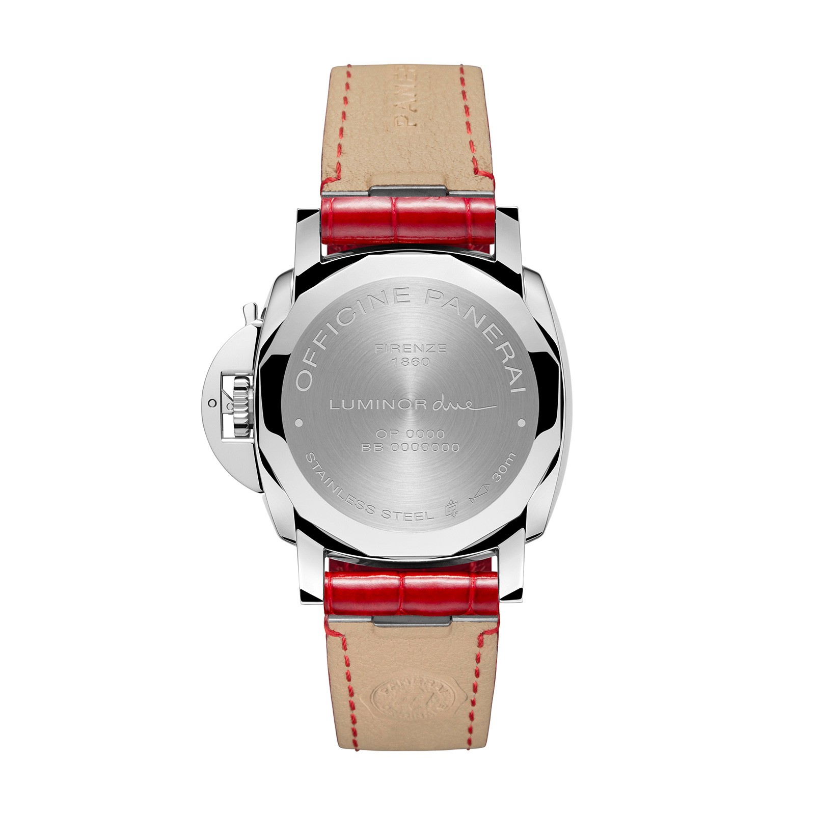 PANERAI watches are a natural blend of Swiss technology, Italian design, and passion for the sea. The designs were modern-looking with minimal lines. The LUMINOR DUE collection is the essence of Panerai, an iconic, simple, and strong design with an unmistakable identity. The dial is ivory sun-brushed with luminous Arabic numerals and hour markers. With a date window at 3 o'clock and a small seconds subdial at 9 o'clock, the strap is a striking red alligator leather with tone-on-tone stitching, 20.0/18.0 standard size width. Discover this fascinating luxury watch brand at Chisholm Hunter today.