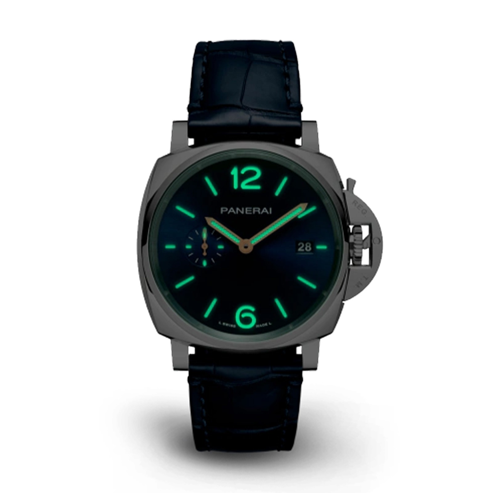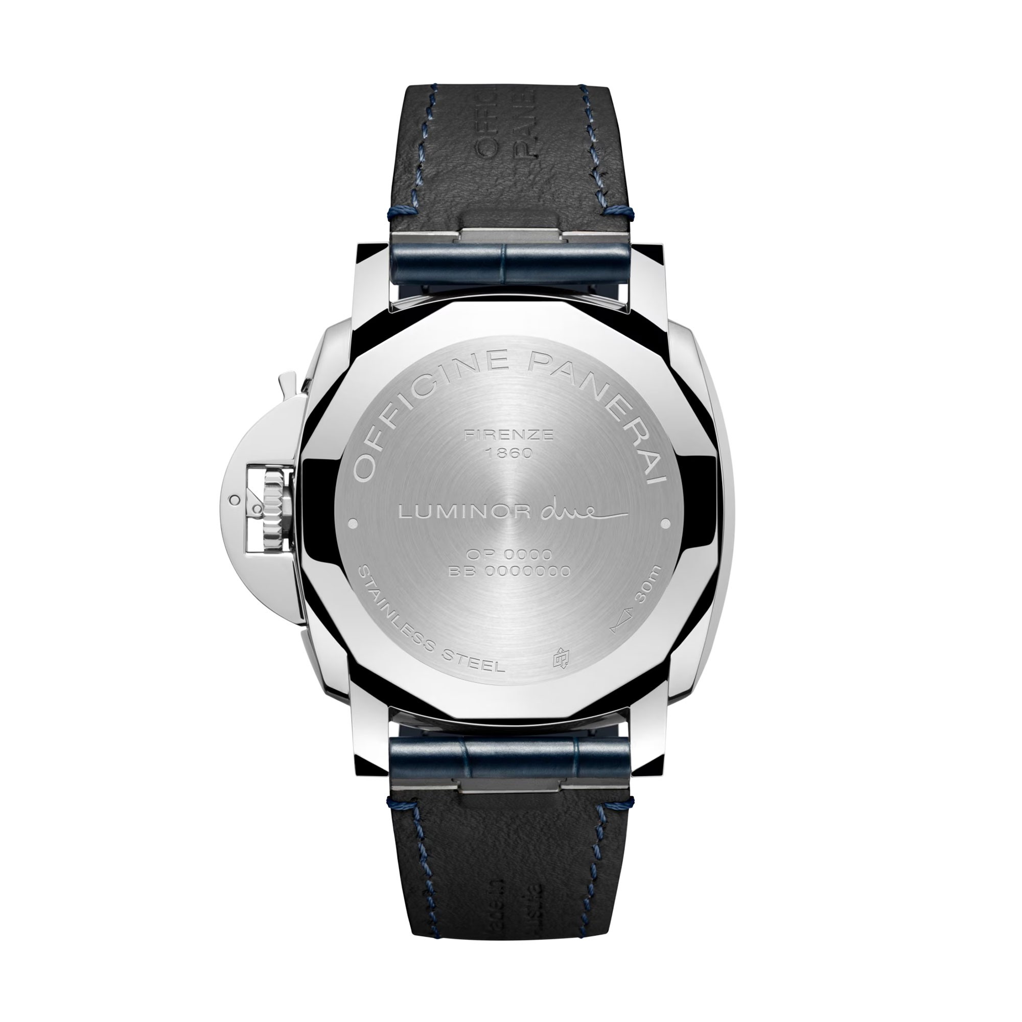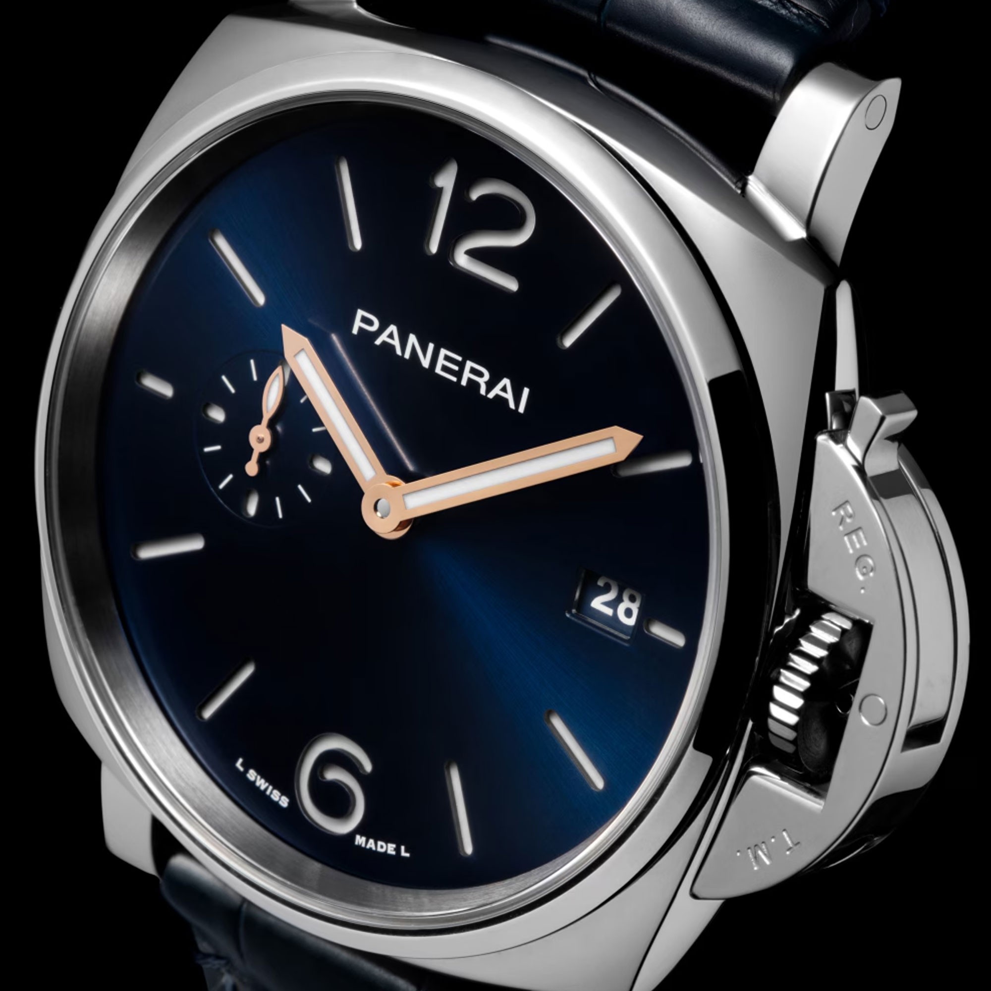 From the Luminor Due collection, discover the Panerai Luminor Due 42mm Mens Watch PAM01274 here today at Chisholm Hunter. Complete with a 42mm wide, square-shaped steel case and blue alligator leather strap with tone-on-tone stitching, the blue dial features luminous hour markers and dots. With a date window at 3 o’clock and small seconds subdial at 9 o’clock, this automatic, mechanical-winding timepiece is powered by the P.900 calibre with a reserve of three days.