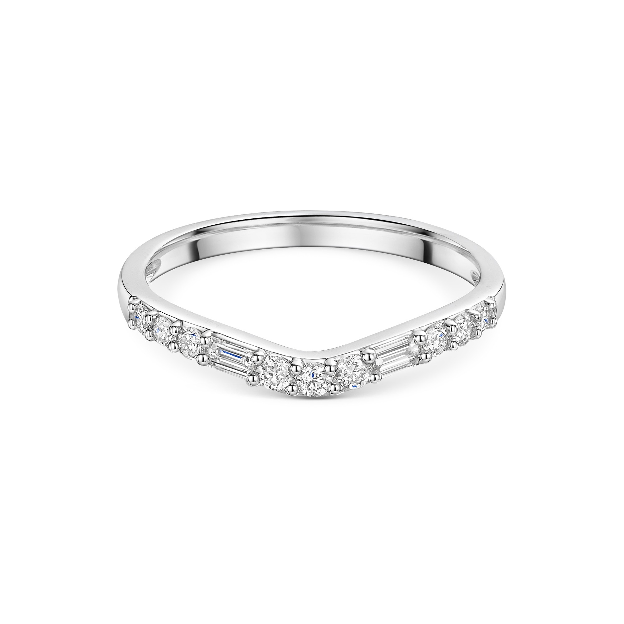 Introducing the Platinum 0.27ct Round Brilliant & Baguette Diamond Wishbone Eternity Ring from Chisholm Hunter. This exquisite ring is crafted from platinum and features a sparkling row of round brilliant and baguette cut diamonds with a total weight of 0.27 carats. The round brilliant and baguette Cut ensures maximum brilliance, highlighting the diamond colours graded G-H and clarity ratings of SI1-SI2. Each diamond is selected for its quality, resulting in a luxurious finish.