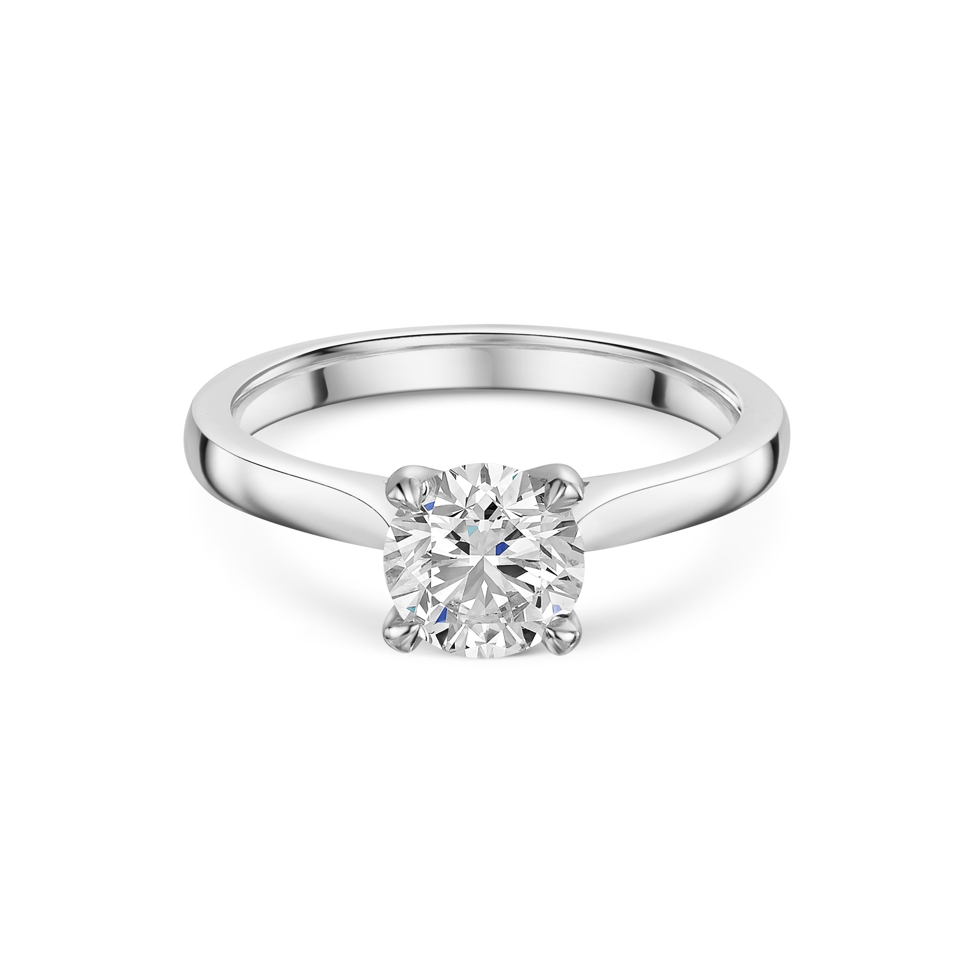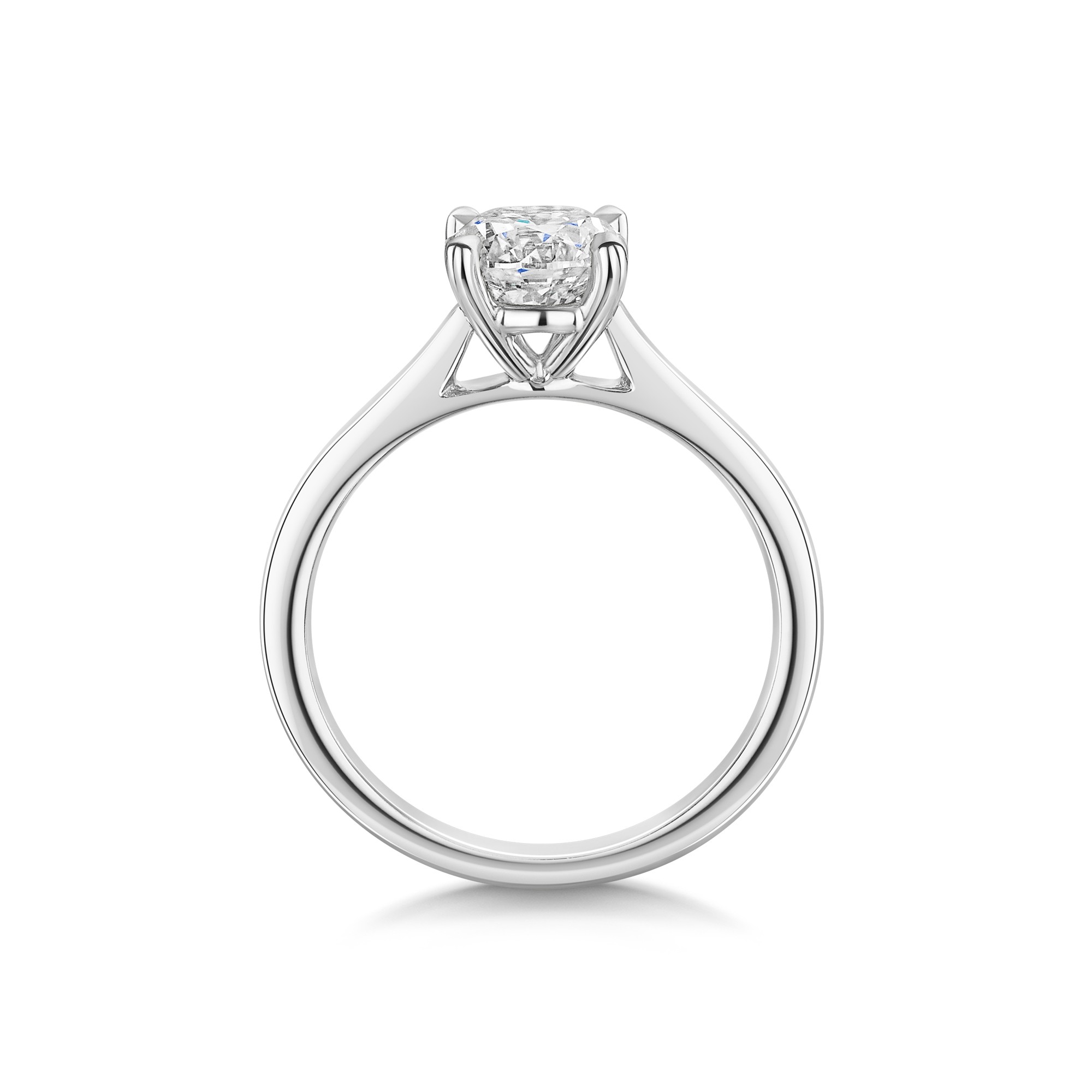 Platinum offers lasting strength and a naturally white lustre that complements the diamond’s brightness. It is hypoallergenic and resists wear, making it suited to everyday elegance. The V-shape head secures the stone while lifting it proud of the band for a crisp, modern profile. A smooth, balanced shank gives a comfortable fit.