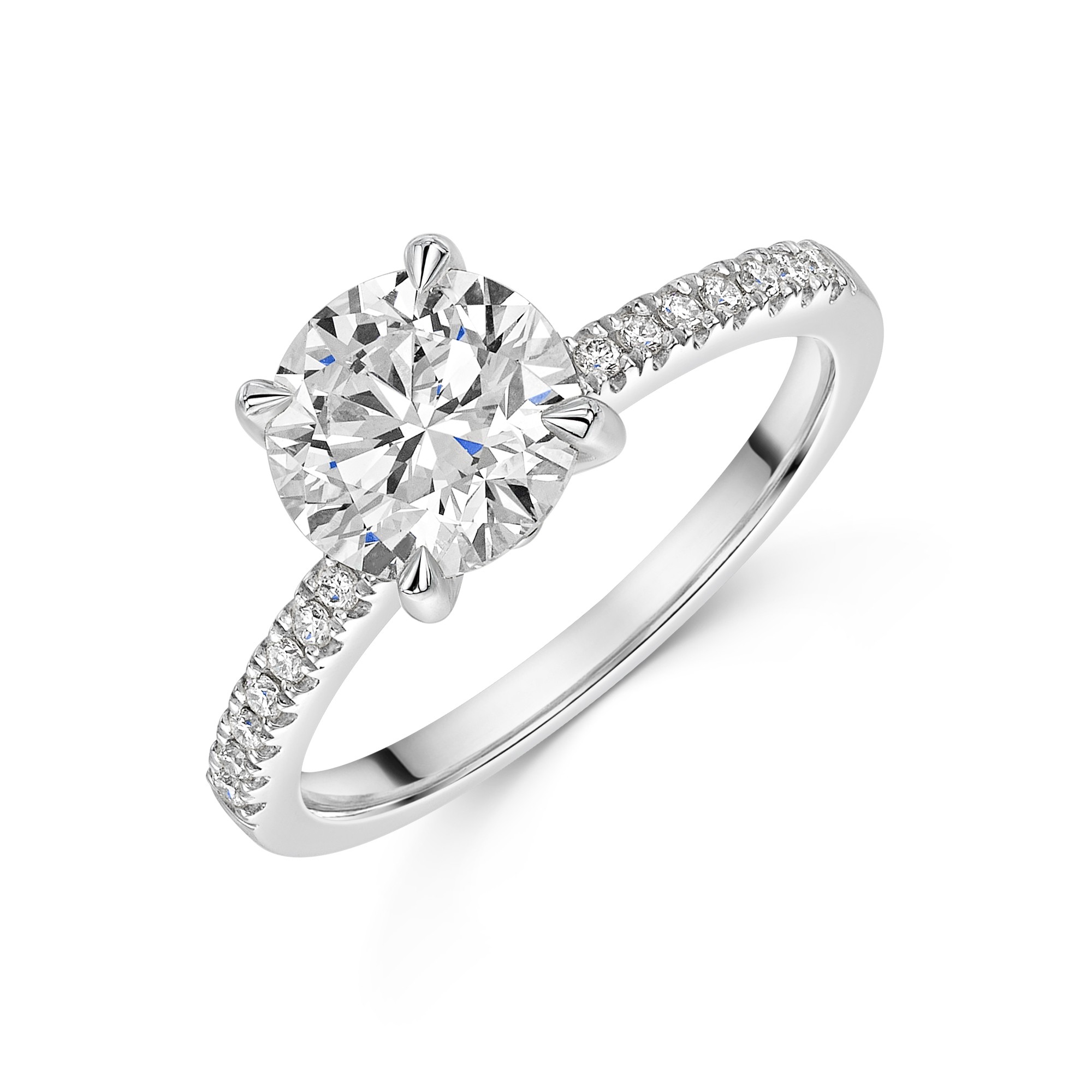 Introducing the Platinum 1.93ct Round Brilliant Diamond Ring with Diamond Shoulders by Chisholm Hunter. This exquisite ring features a stunning 1.80ct round brilliant diamond at its centre. The additional diamonds on the shoulders enhance its brilliance, making it the perfect choice for special occasions.