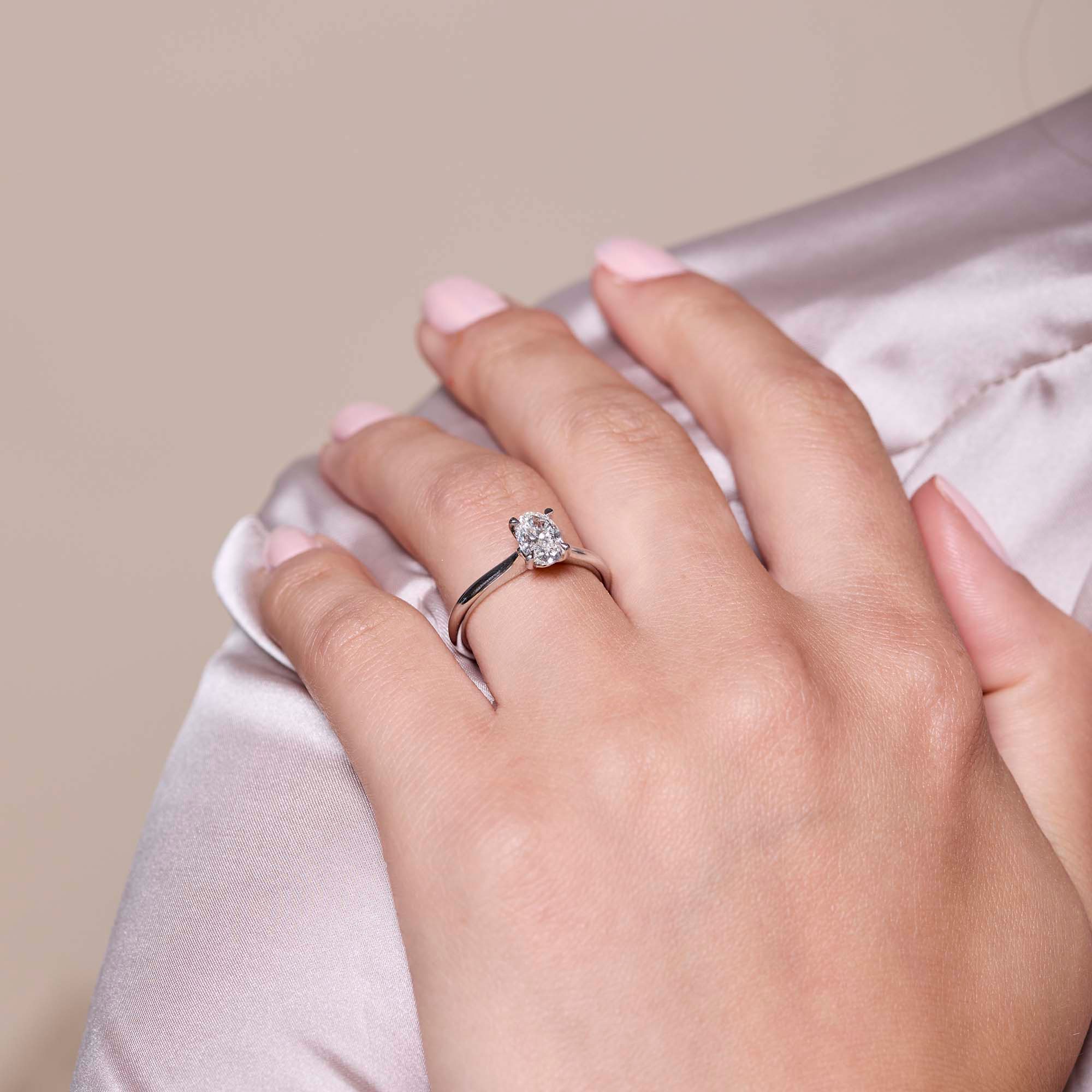 The ring showcases a mesmerising 1.00ct oval-cut diamond that captures the light brilliantly, ensuring that it will gleam as brightly as your love through the years. The clear diamond, set in luxurious platinum, offers a modern yet classic allure that is impossible to resist. The diamond itself is of superb quality, boasting a colour grading of H, which ensures a white appearance that enhances its sparkle and fire. Moreover, each diamond comes with a GIA Diamond Certificate, guaranteeing its quality and authenticity.