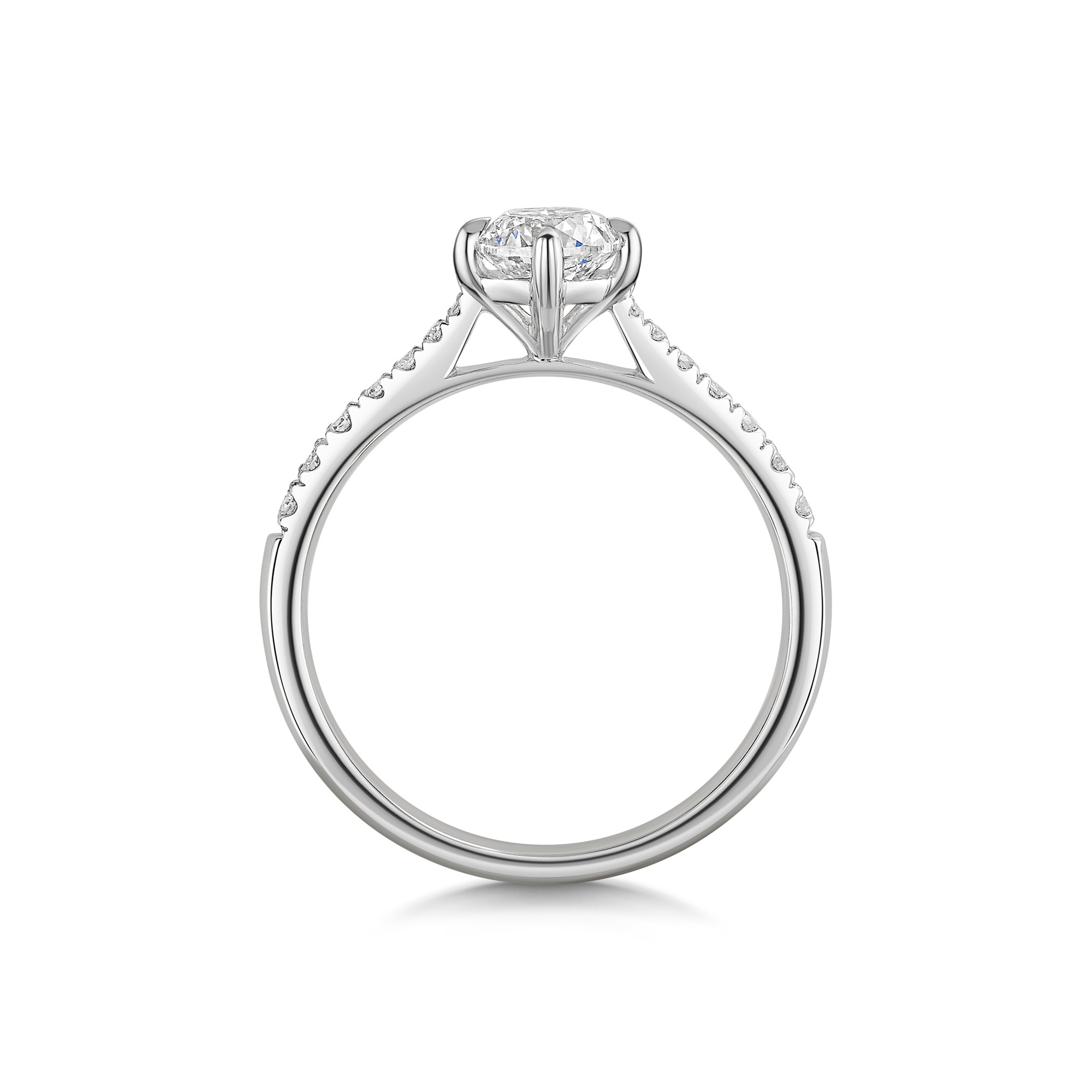 Crafted in premium platinum, the ring features a classic 4 claw setting that securely holds the centre stone while enhancing its brilliance. The claw set shoulders add an elegant touch, making this piece perfect for any occasion.
