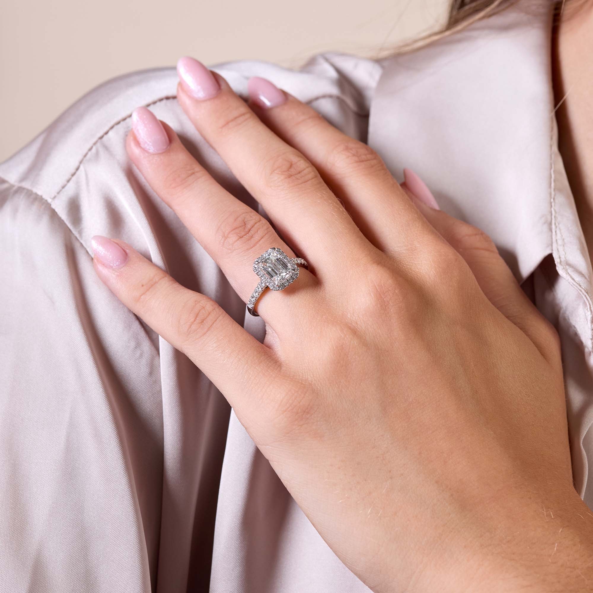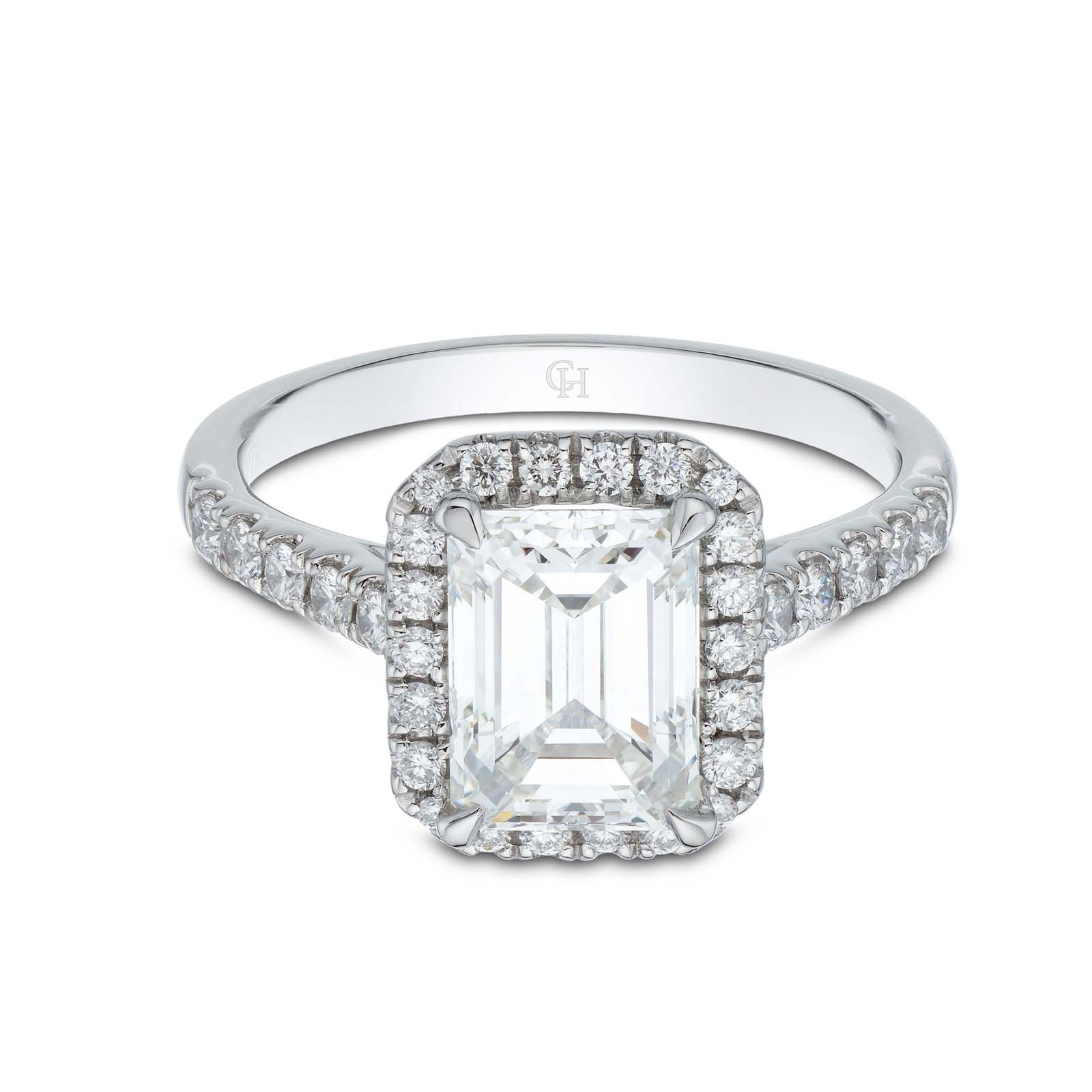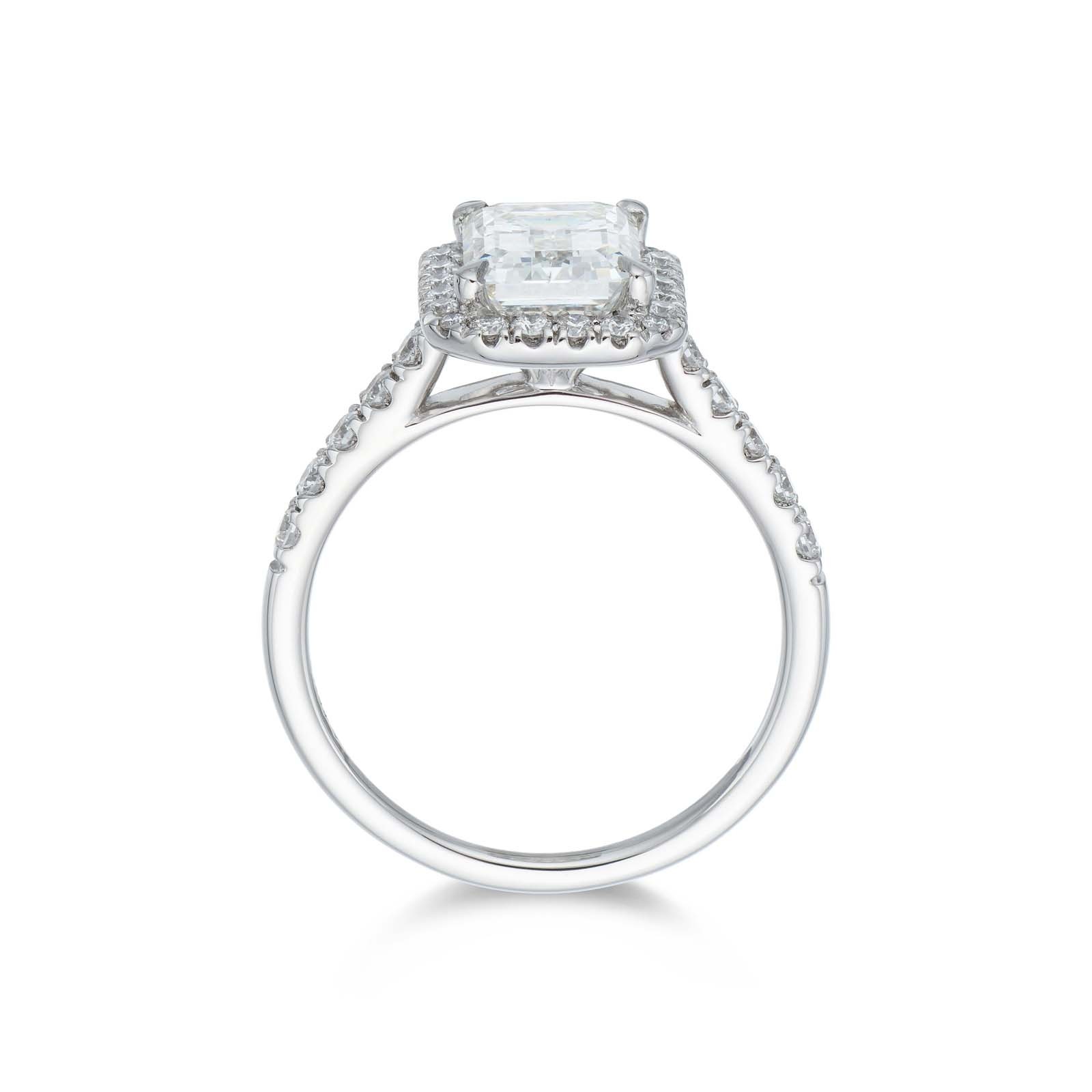 Begin the next chapter with your loved one, with this platinum emerald diamond halo solitaire ring. Sparkling with vintage glamour, this piece features a dazzling emerald cut diamond solitaire enhanced by a breathtaking halo of round brilliant diamond and diamond shoulders. With an overall diamond weight of 2.50ct, this ring is willed with the most sophisticated sparkle. Diamond Information: Cut- Emerald Cut & Round Brilliant, Carat- 2.50ct