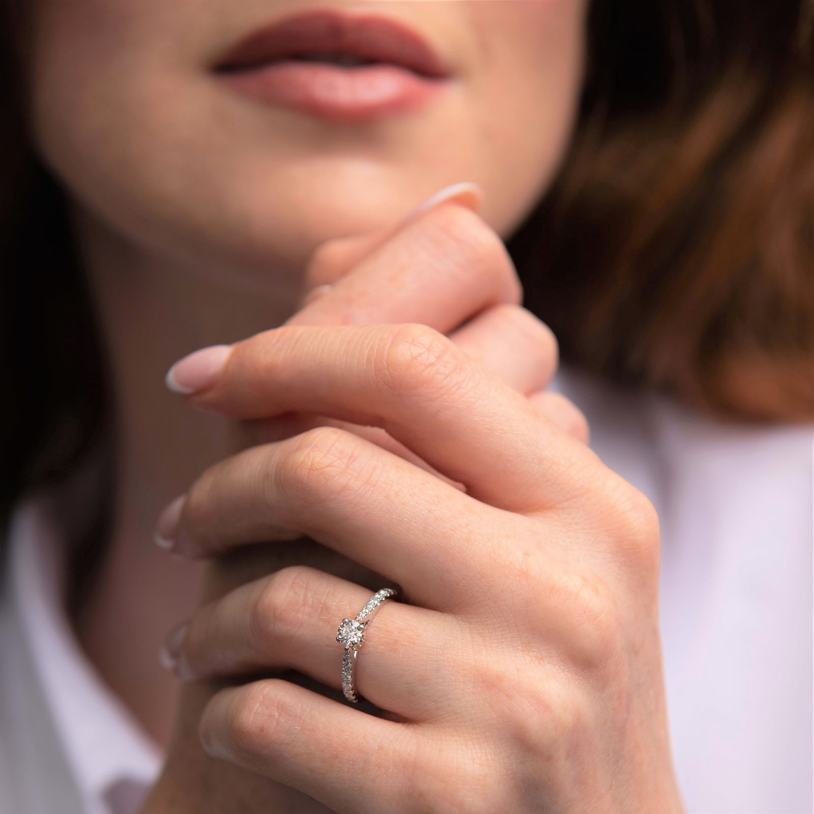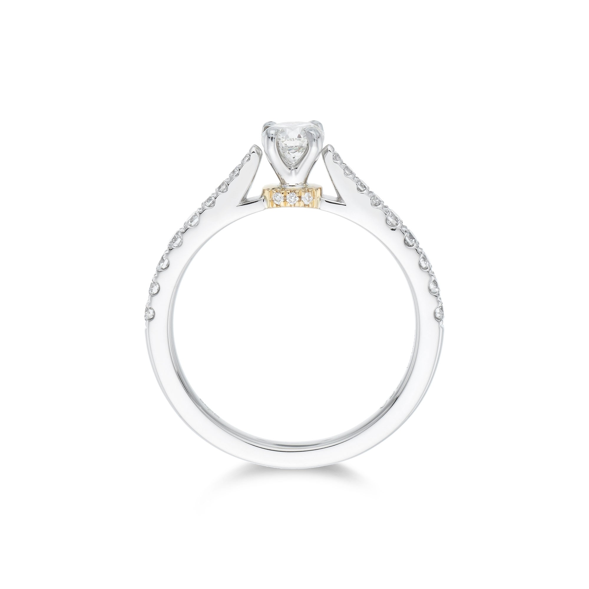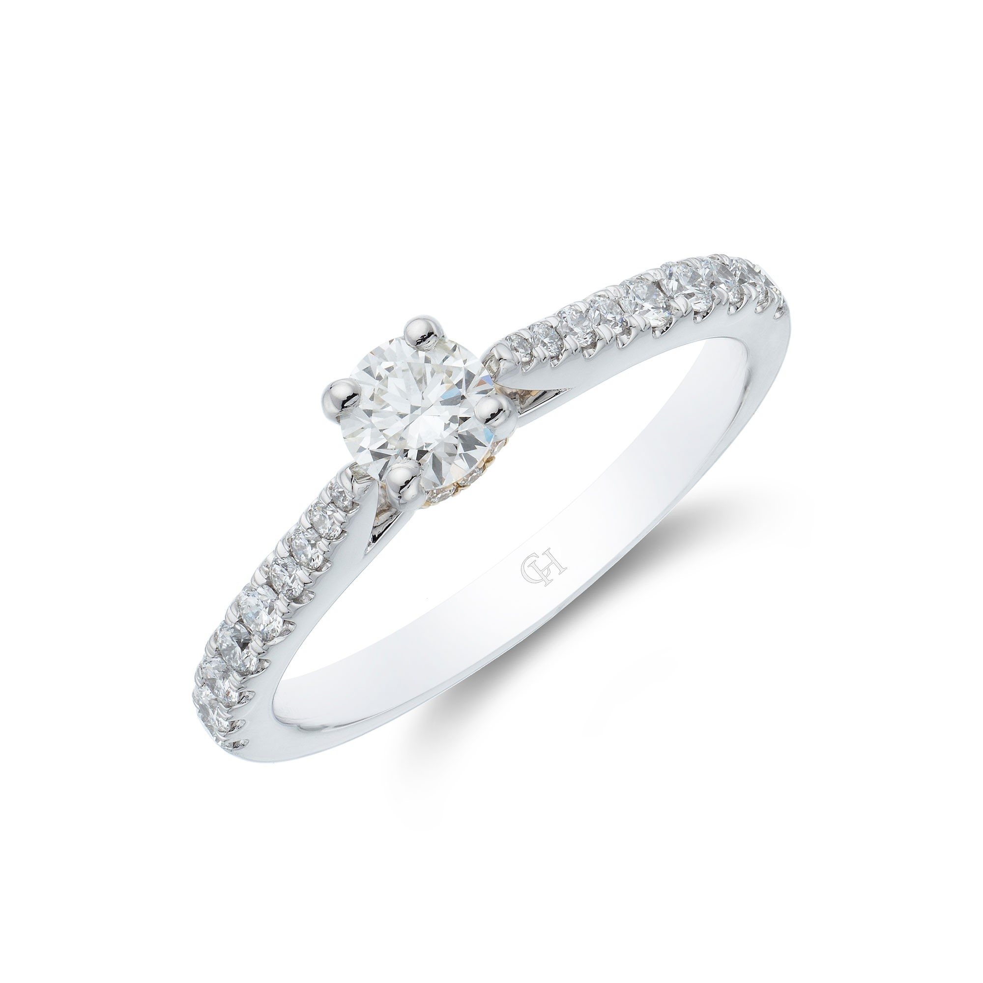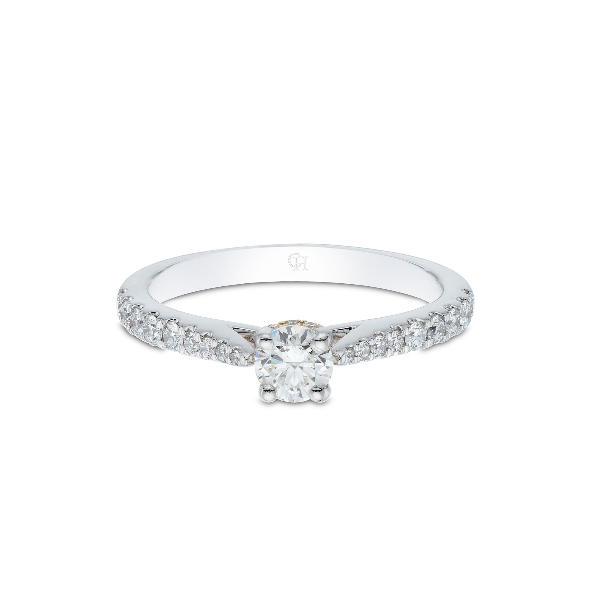This Platinum Brilliant Cut 0.33ct Diamond Solitaire Ring from Chisholm Hunter will glisten and sparkle from the hand of your loved one. The ring features a brilliant cut diamond with diamond shoulders to enhance its natural radiance and fire. The diamonds illuminate a silky platinum band and four-claw setting. Diamond information: Cut – Round brilliant, Colour – G-H, Clarity – SI, Total Carat Weight – 0.58ct.