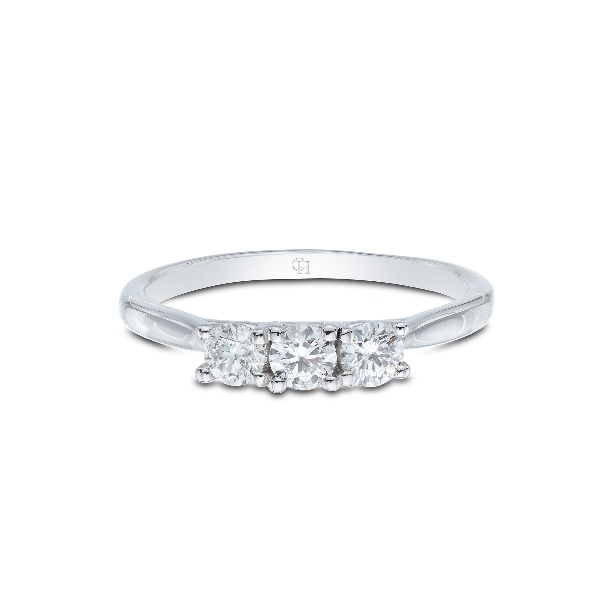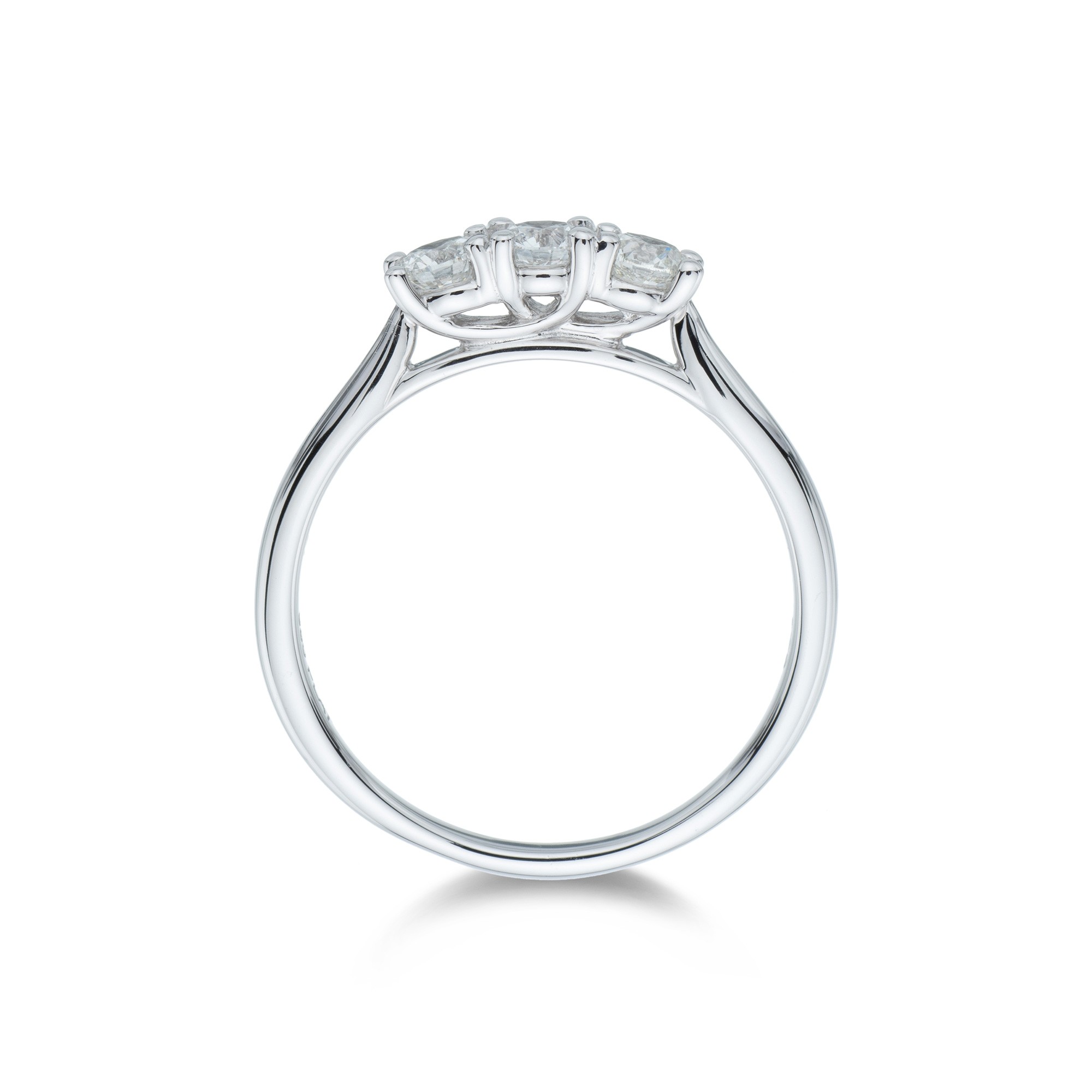 Begin the next chapter with your loved one with this platinum engagement ring with a total diamond weight of 0.50ct. Three uniform round brilliant diamonds with a total diamond, set in a 4 claw setting perfectly represent you and your loved ones past, present and future. This engagement ring is the finishing touch to your romantic proposal. Diamond Information: Cut- Round Brilliant, Colour- G-H, Clarity- SI1-SI2, Carat- 0.50ct.
