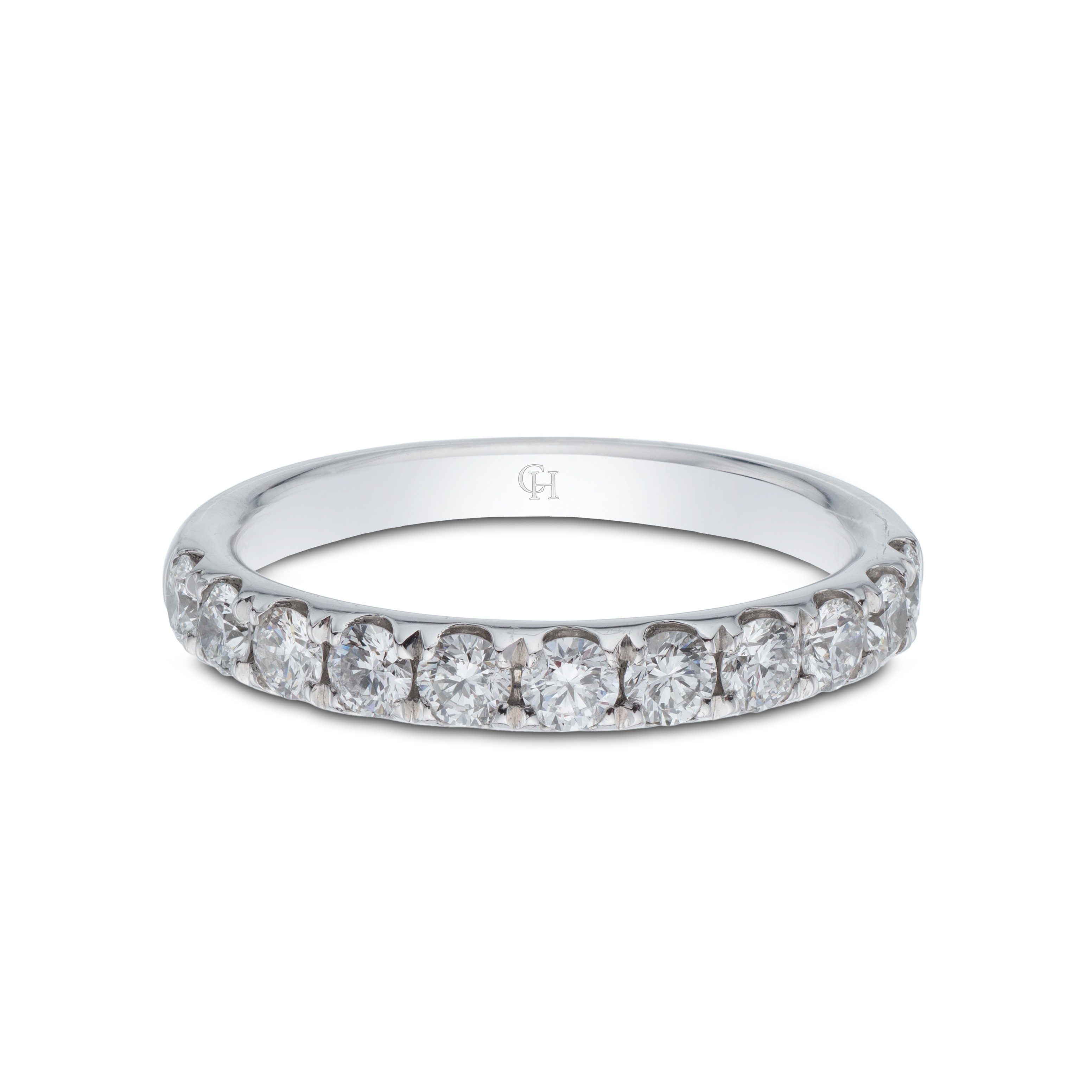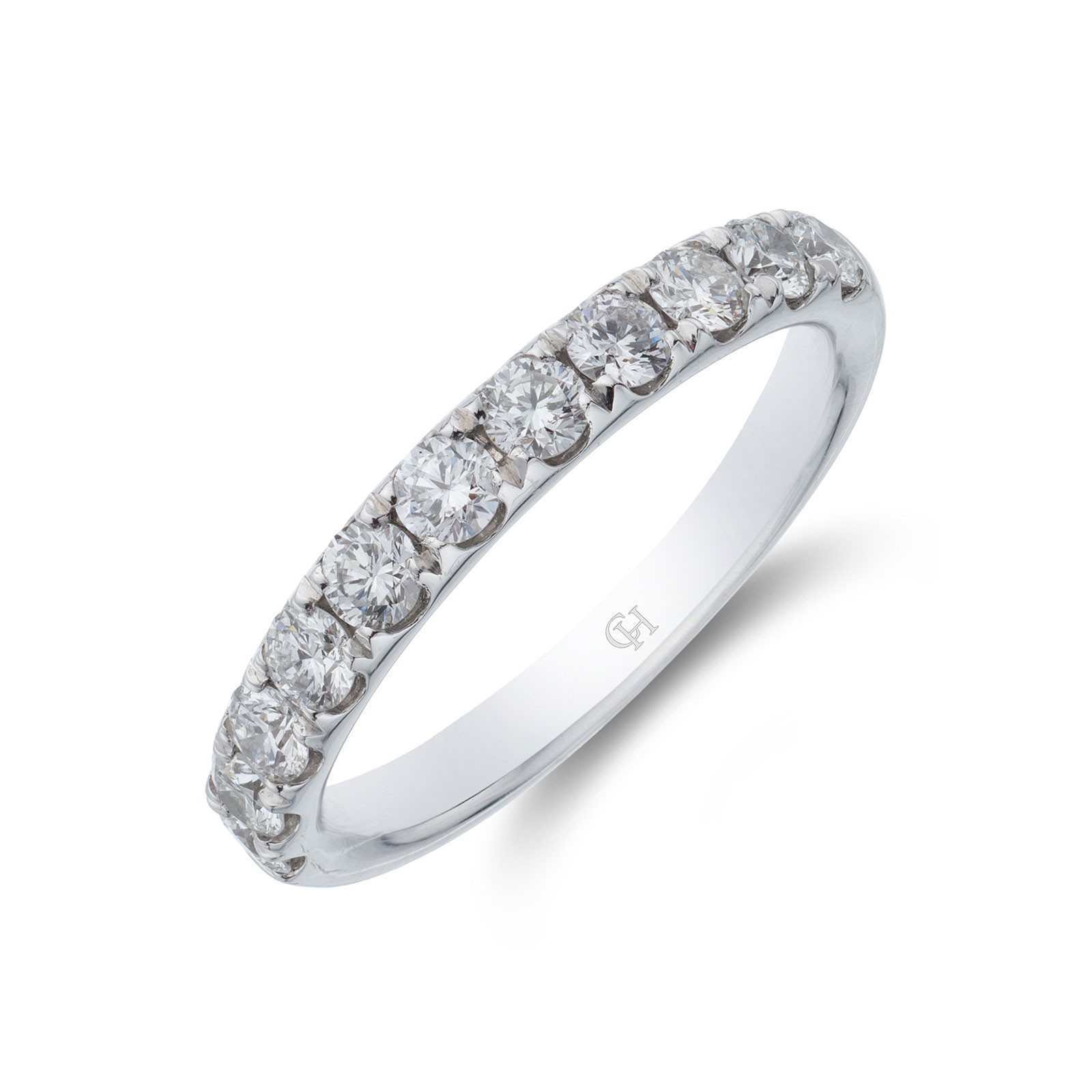 Platinum band with round brilliant cut diamonds weighing an approximate total of 0.75ct held in a 4 claw setting.