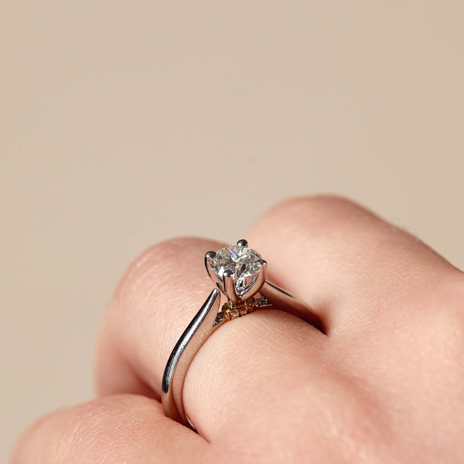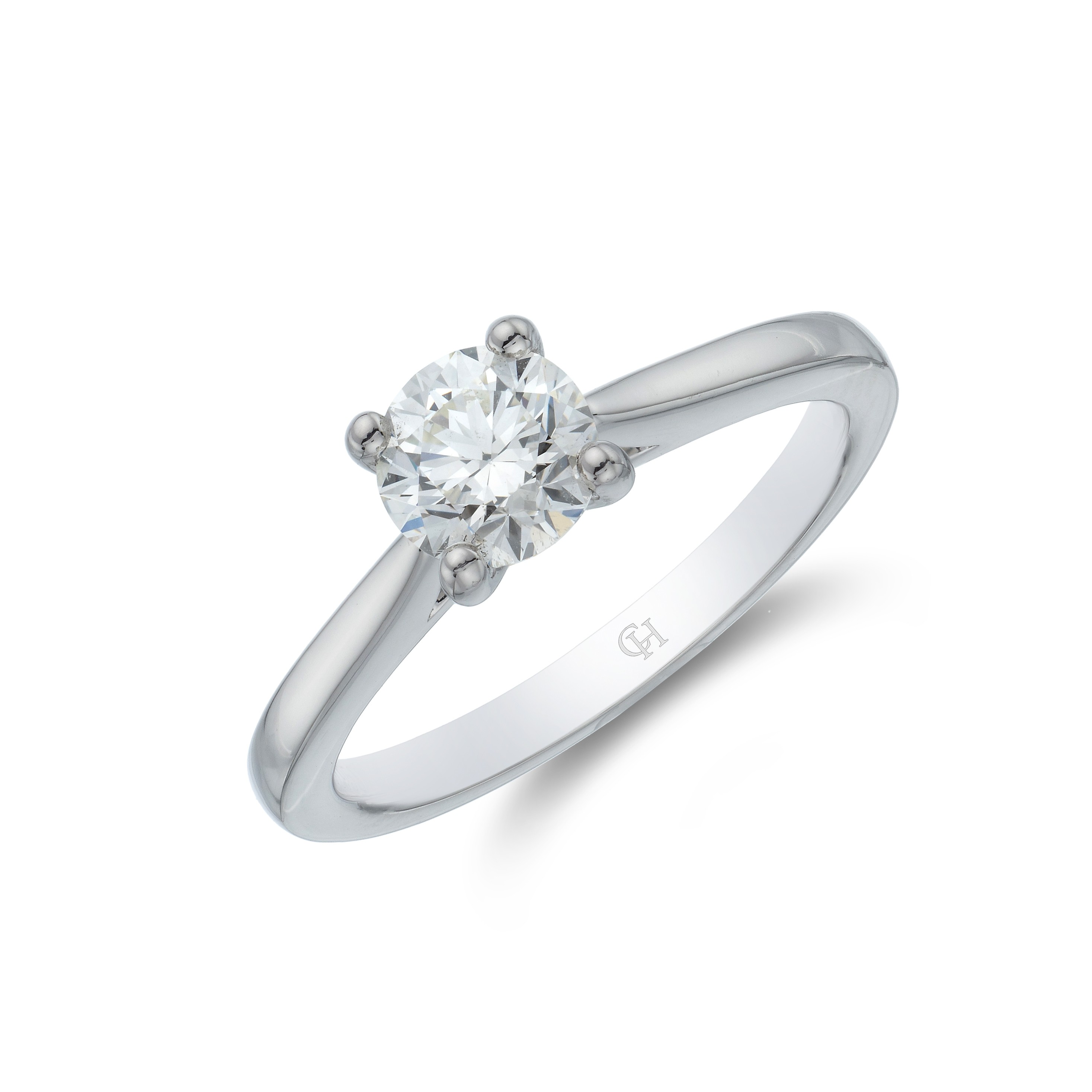 The timeless silhouette of this platinum brilliant cut 0.75ct diamond solitaire ring makes it the perfect piece to show your eternal love. The silky platinum band holds the brilliant cut diamond in a classic four-claw setting, with a hidden trio of diamonds on yellow gold below so it is only visible to the wearer. Diamond Information: Cut – Brilliant, Colour – G-H, Clarity – SI, Total Carat – 0.77ct.