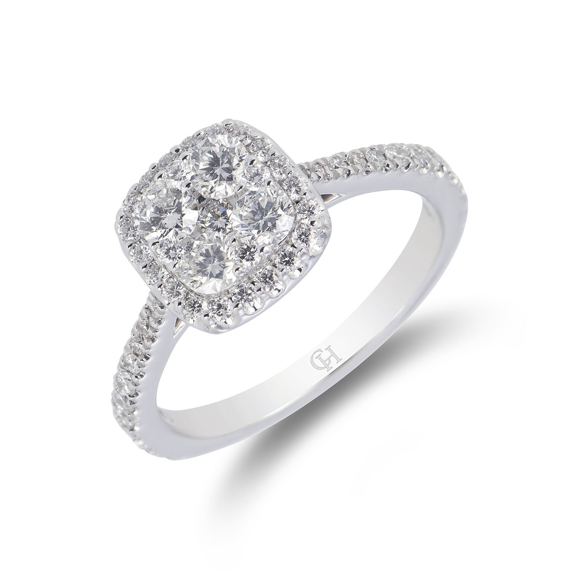 Make the most unforgettable moment of your life truly memorable with this platinum diamond cluster engagement ring. A beautifully unique design; a cluster of round brilliant cut diamonds, with a total carat weight of 1.00, create a sparkling square shape that is further enhanced by the rings dazzling diamond shoulder.