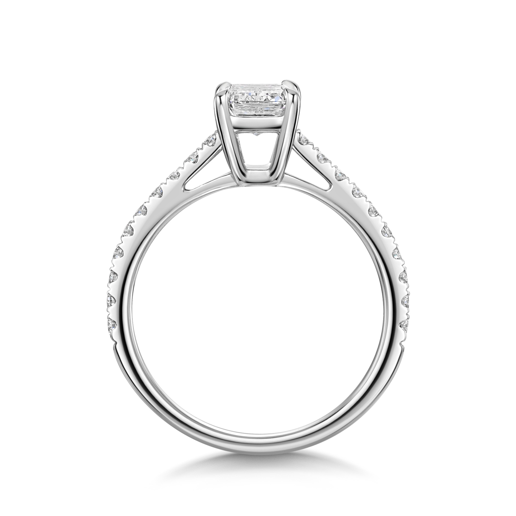 Make it the perfect proposal with the Platinum Lab Grown 1.00ct Emerald Diamond Shoulders Ring, a stunning piece that embodies elegance and sophistication. This exquisite ring showcases the enchanting beauty of a lab-grown emerald-cut diamond, perfectly complemented by shimmering diamond shoulders. The centrepiece of this captivating ring is a lab-grown emerald-cut diamond with a weight of 1.00ct. The emerald cut, with its step-cut facets and elongated shape, accentuates the diamond's clarity and creates a striking presence. The sparkling diamond shoulders not only add extra glamour and radiance but also create a seamless transition between the centre diamond and the band. Diamond Information: Cut- Emerald, Colour- F, Clarity- VS2, Carat- 1.25ct.