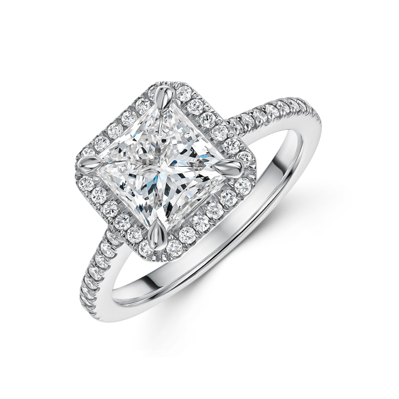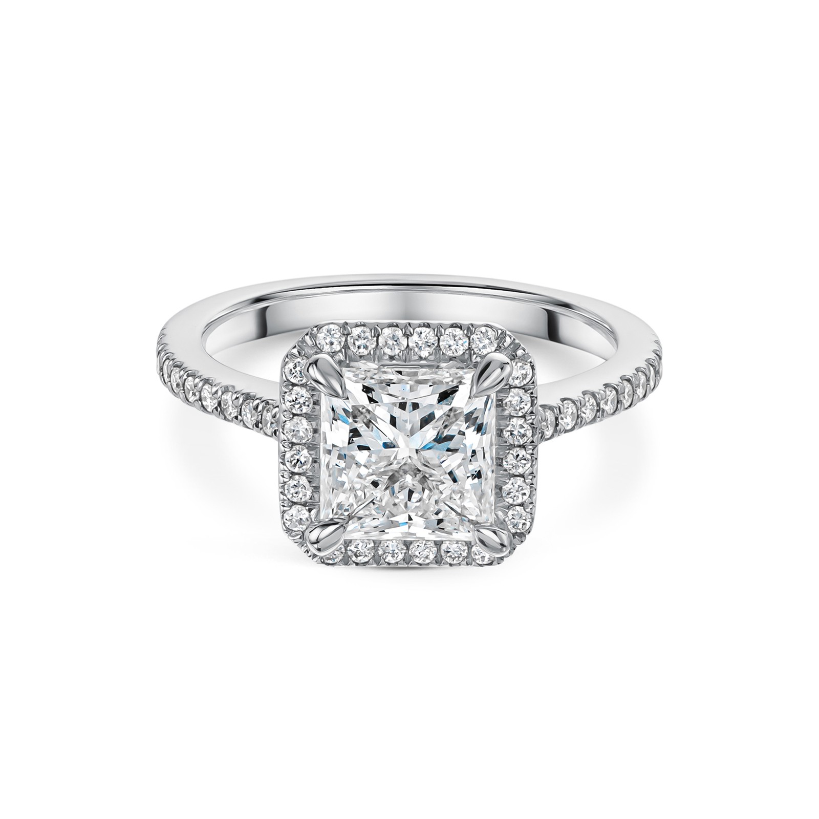 Crafted with meticulous attention to detail, this ring is set in lustrous platinum, the epitome of timeless elegance. At its heart lies a mesmerising 2.25ct lab-grown princess-cut diamond, encompassed by a halo of shimmering diamonds that amplify its splendour. This magnificent stone is not only a testament to modern innovation but also stands as a beacon of sustainability and ethical luxury.