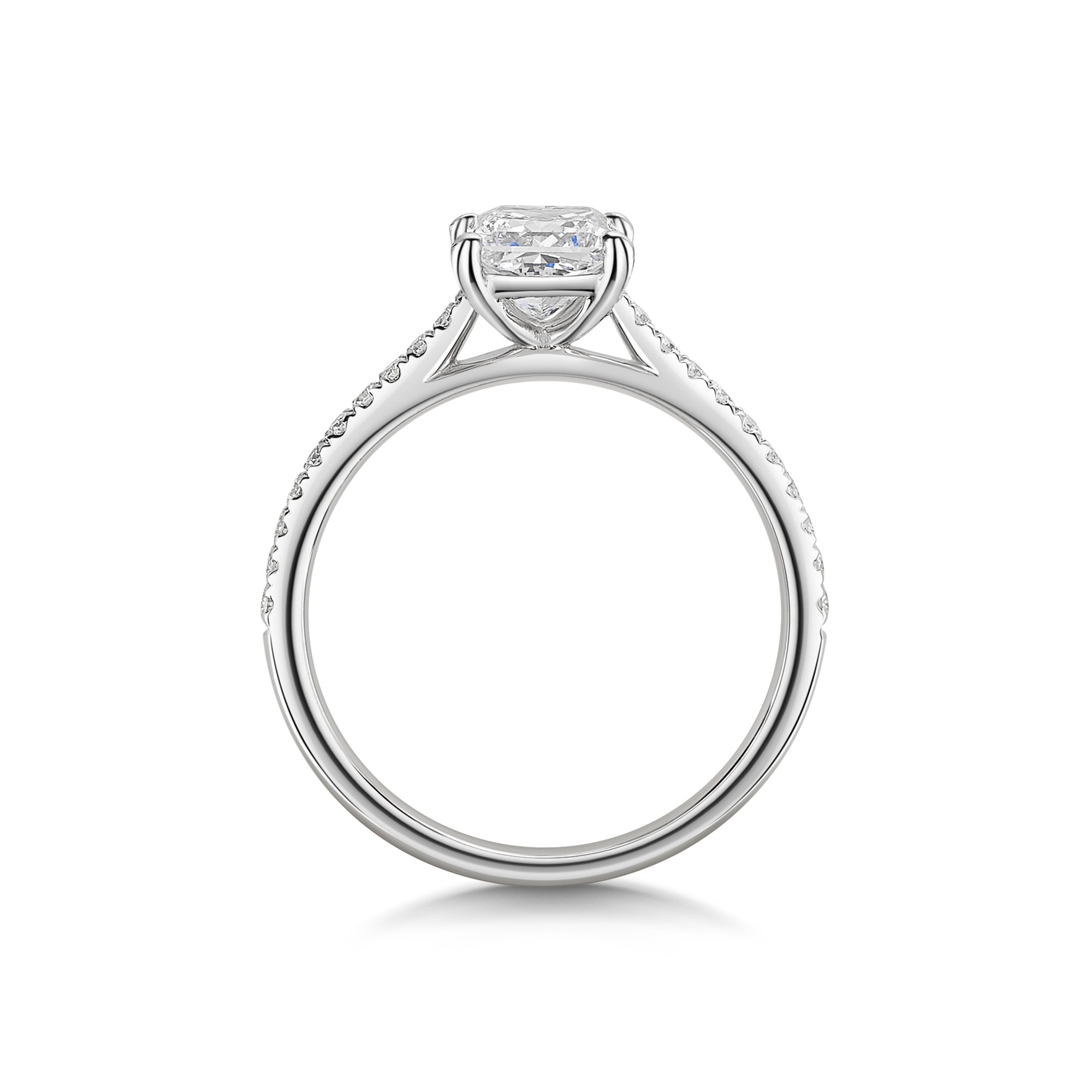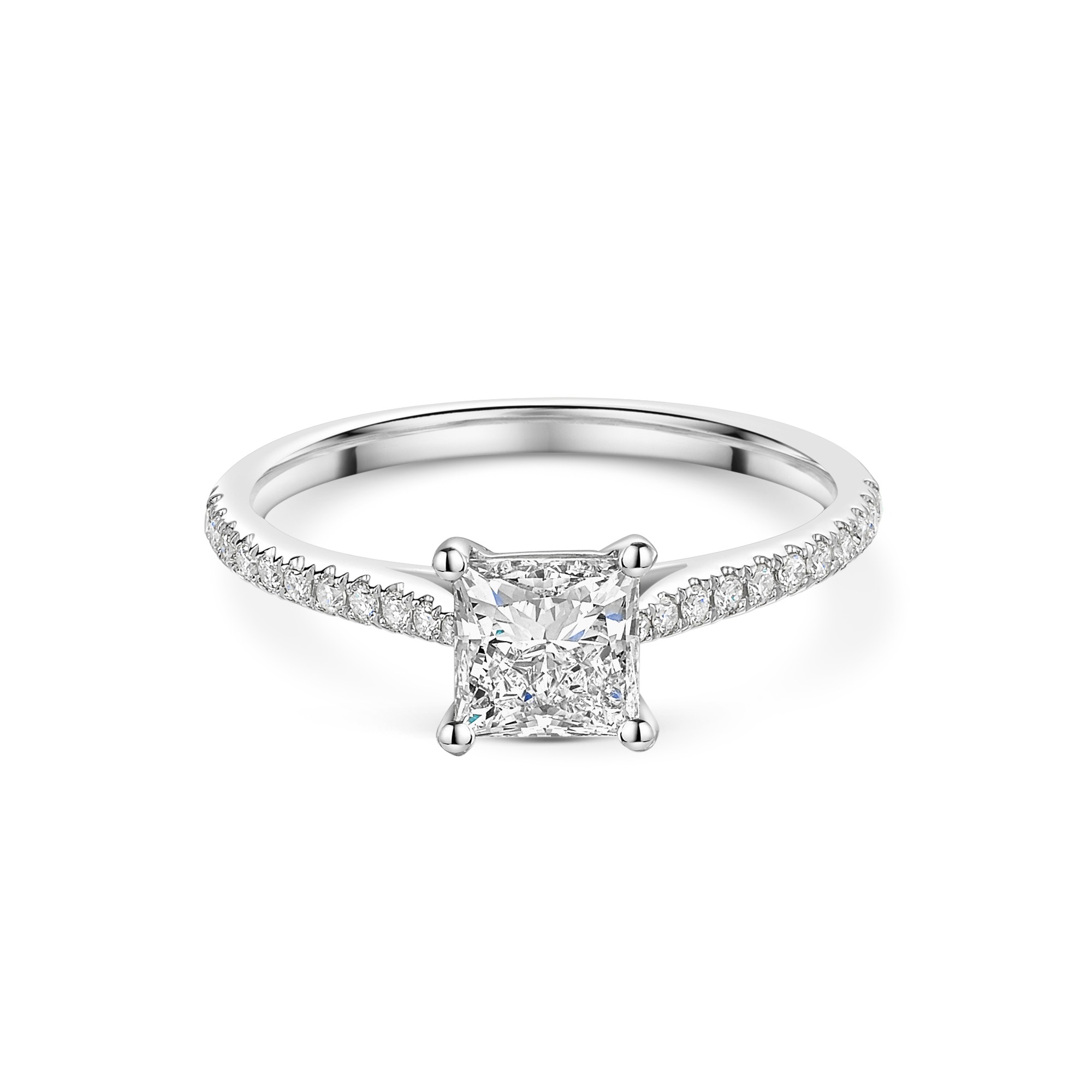 Presenting the exquisite Platinum Lab Grown Princess Cut 1.25ct Diamond Solitaire Ring with Shoulders from Chisholm Hunter. Crafted in premium platinum, this ring features a stunning princess cut lab grown diamond with a total carat weight designed to impress.