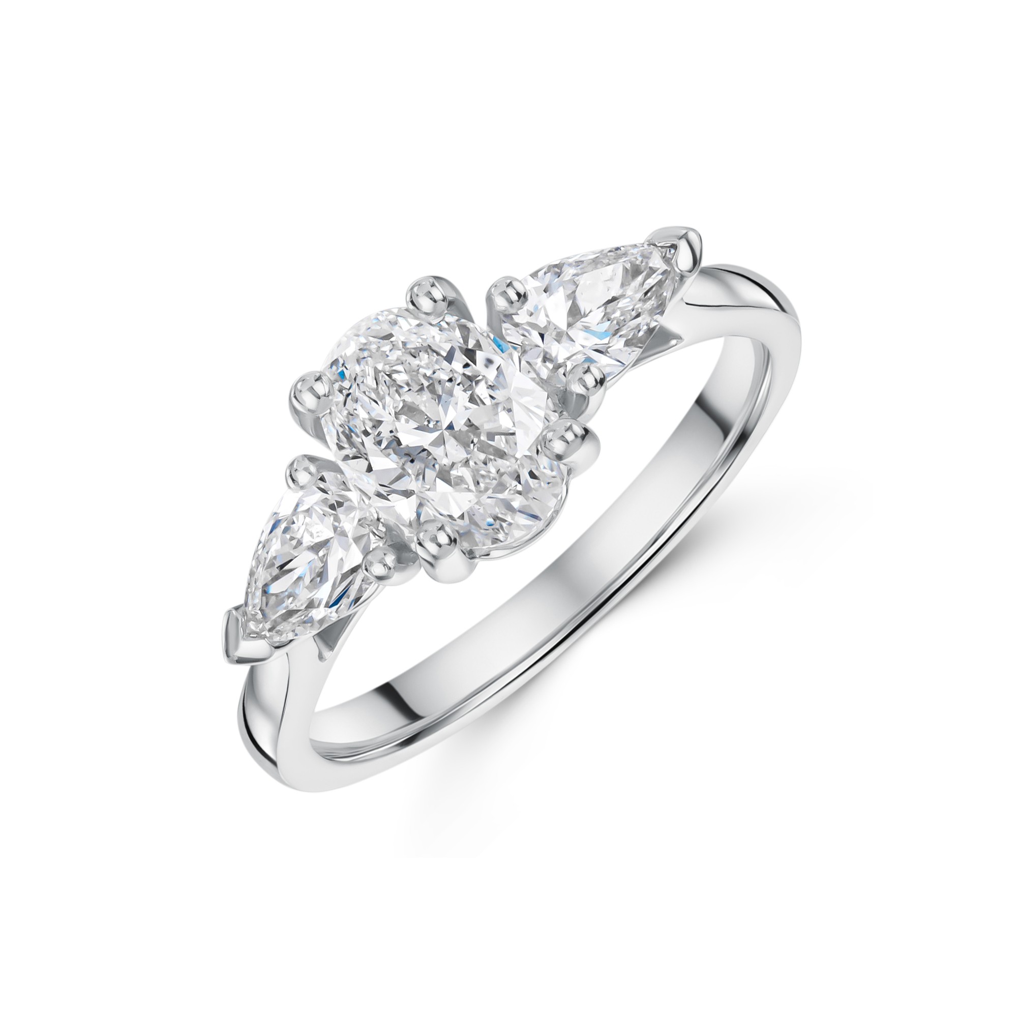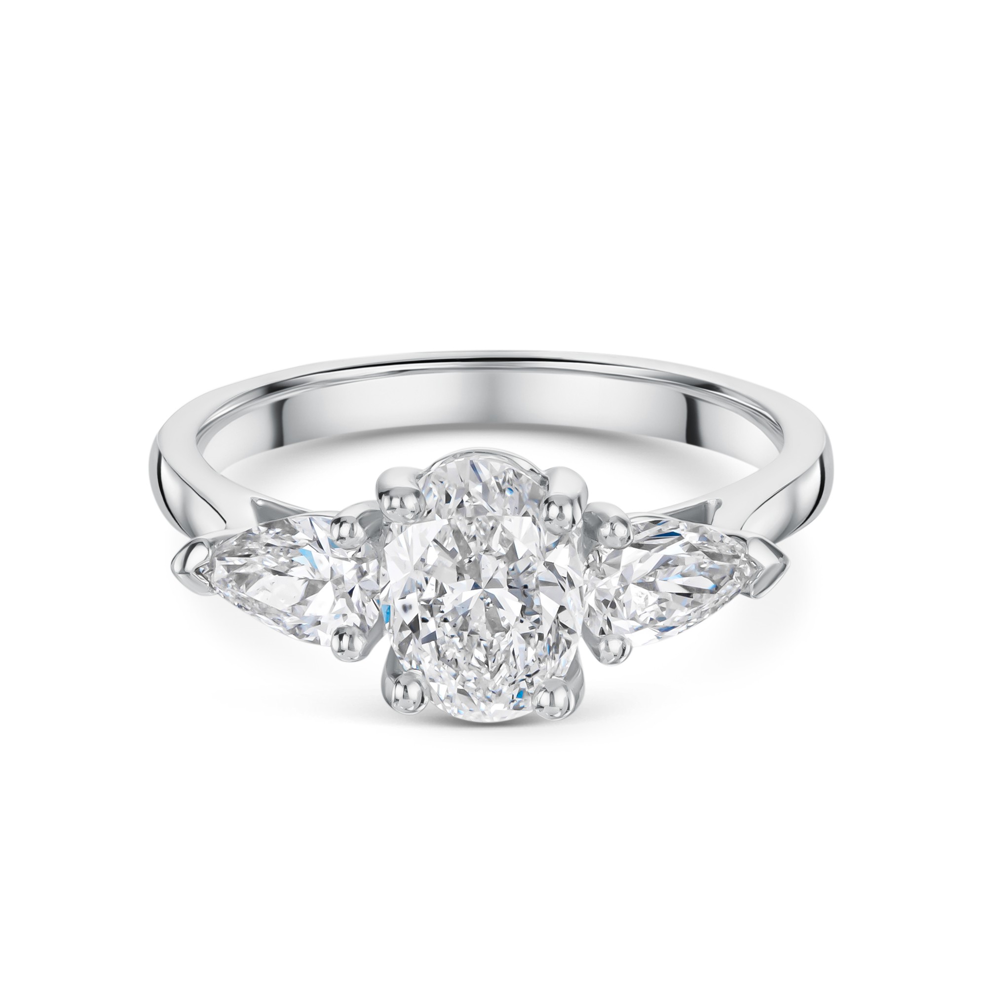 Crafted in luxurious platinum, this ring boasts a captivating combination of oval and pear cut diamonds, totalling an impressive 2.00 carats. The centre stone, with a generous weight of 1.20 carats, is surrounded by two dazzling side stones, each weighing 0.33 carats. With their immaculate clarity and colour, these stones are sure to catch the light and create an attention-grabbing sparkle.