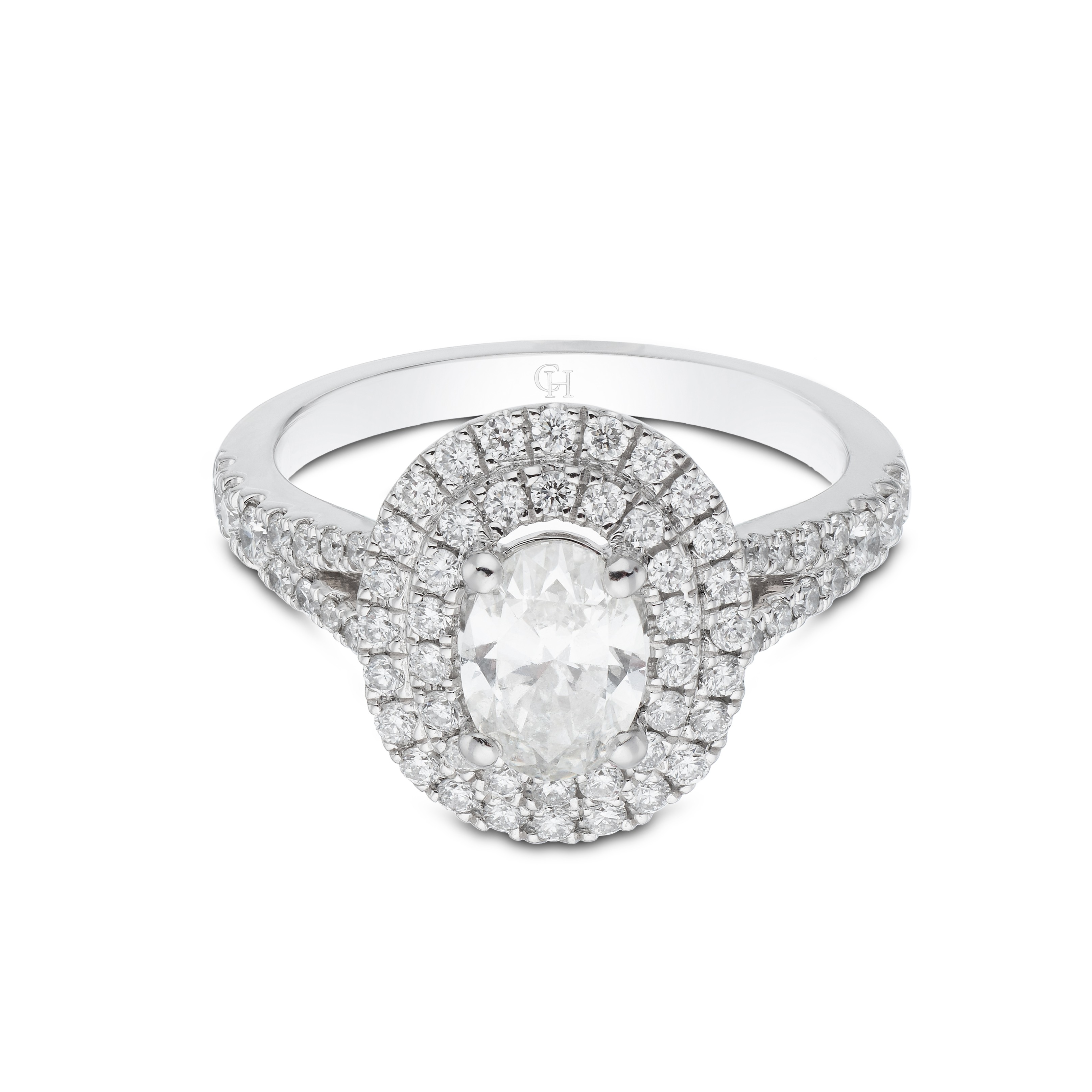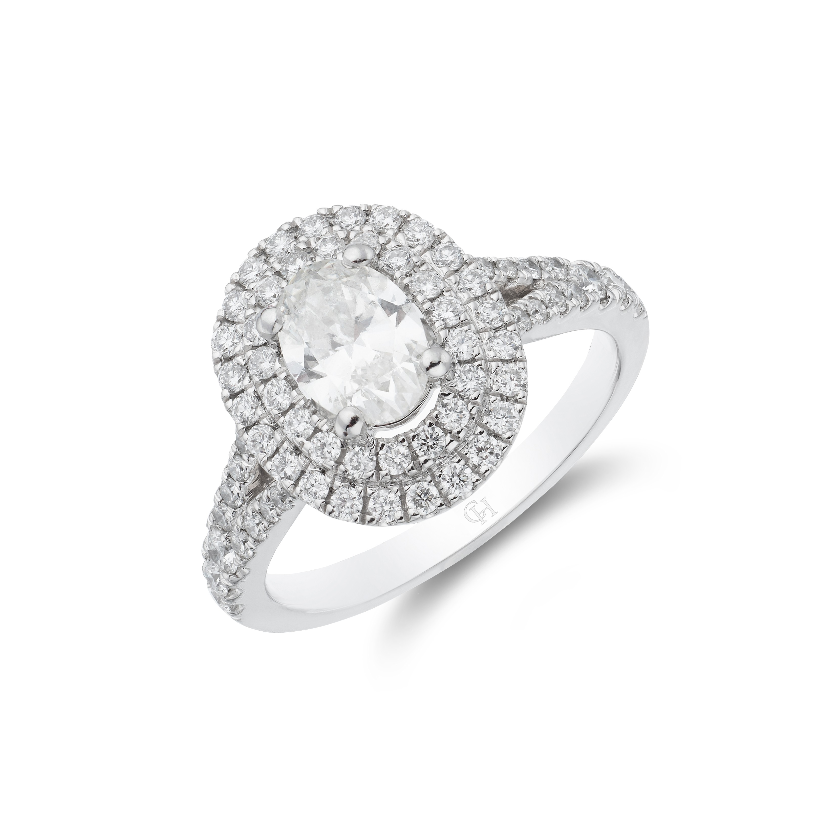 An elegant oval cut diamond is intensified by a sparkling double halo and supporting diamond shoulders in this Platinum Oval Cut 0.75ct Diamond Halo Solitaire Ring from Chisholm Hunter. Set on a platinum band, this ring is perfect for those who love the look and feel of all things luxurious. Diamond information: Cut – Oval, Colour – G-H, Clarity – SI, Total Carat – 1.30ct.