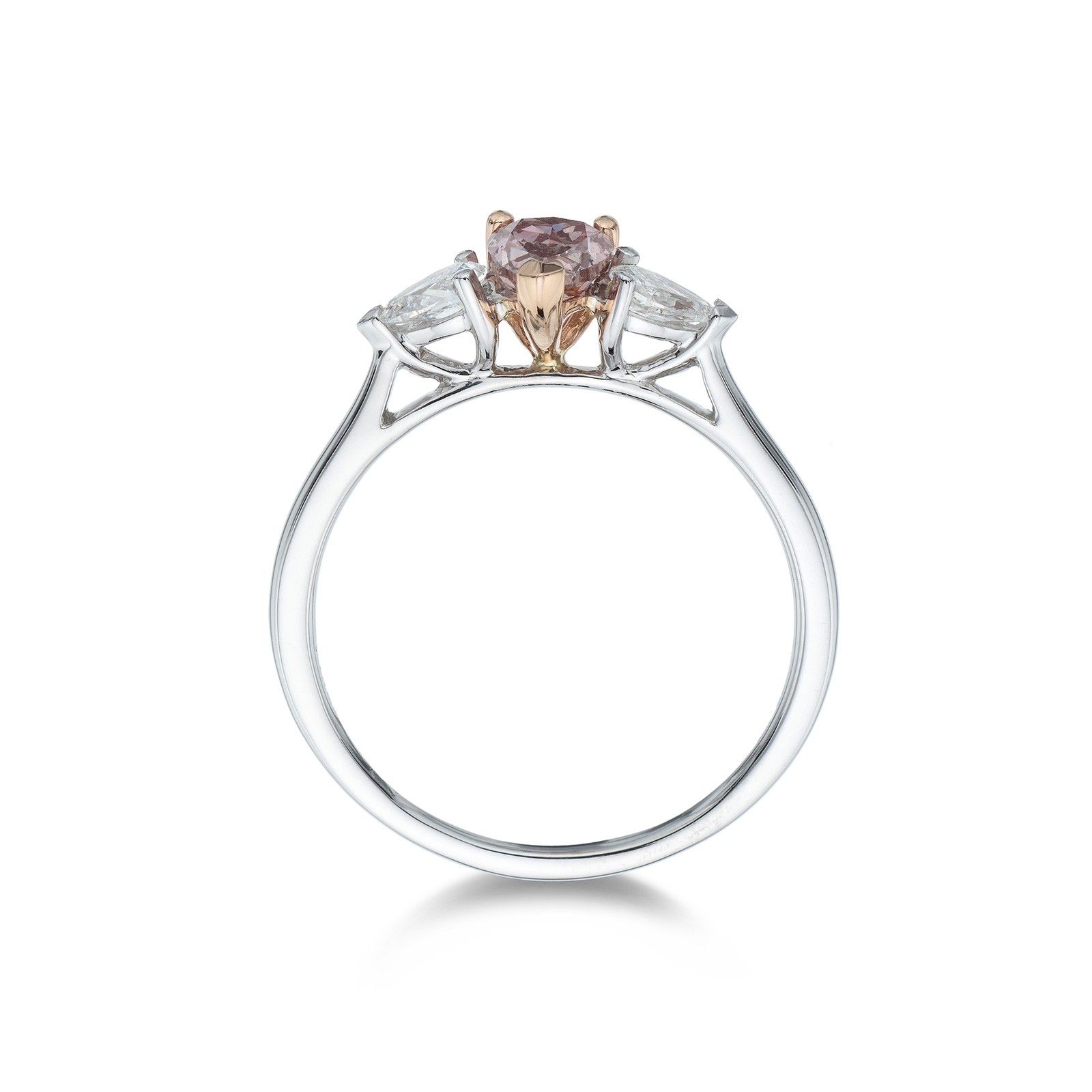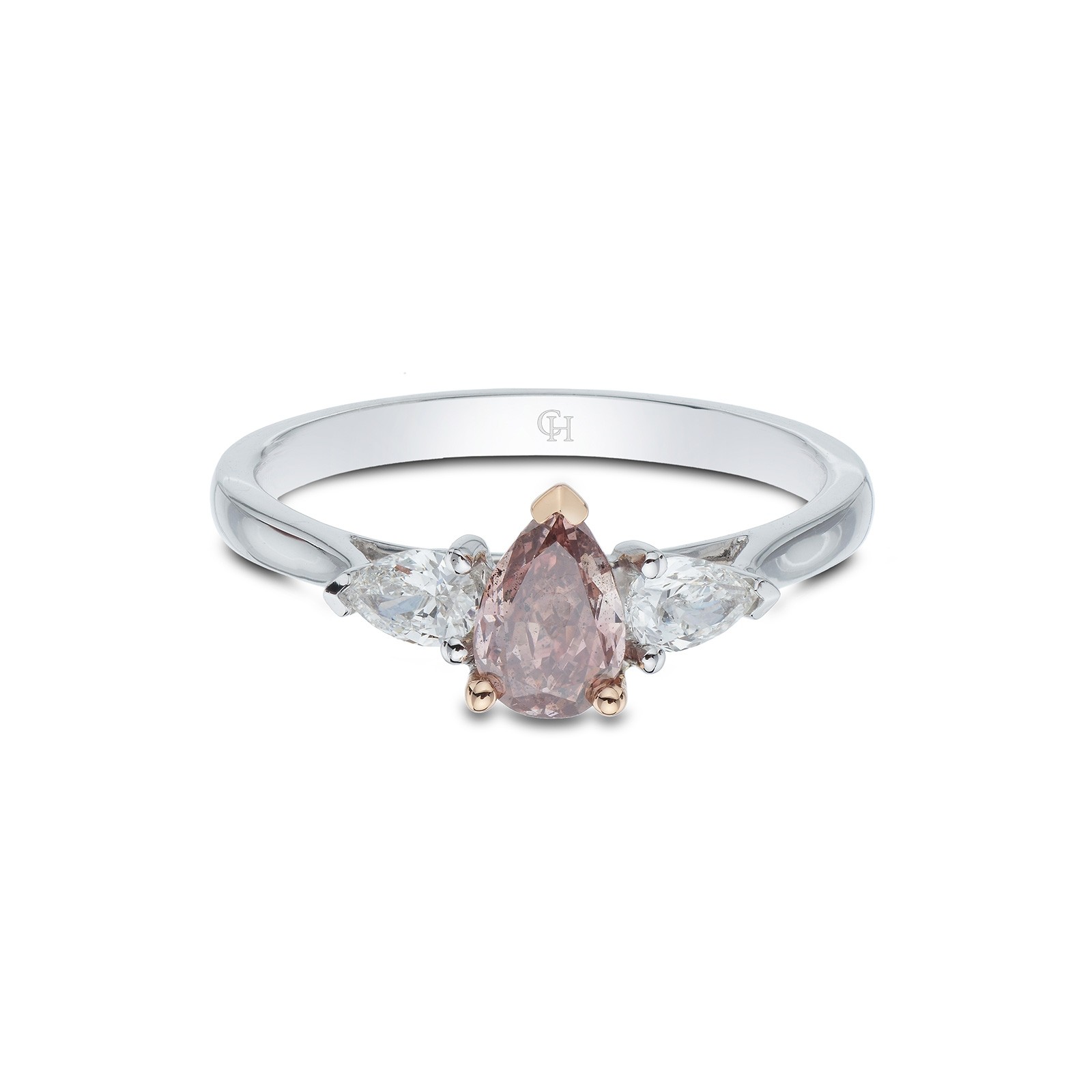 The inviting soft glow of this pink pear cut diamond glistens beautifully against the round brilliant halo cluster. Delicately held with 3 claw detailing, this feminine, romantic look is complete with sparkling, double row diamond shoulders and is set on a smooth & sophisticated mix of white & rose gold ring. Approximately 1.35ct total weight.