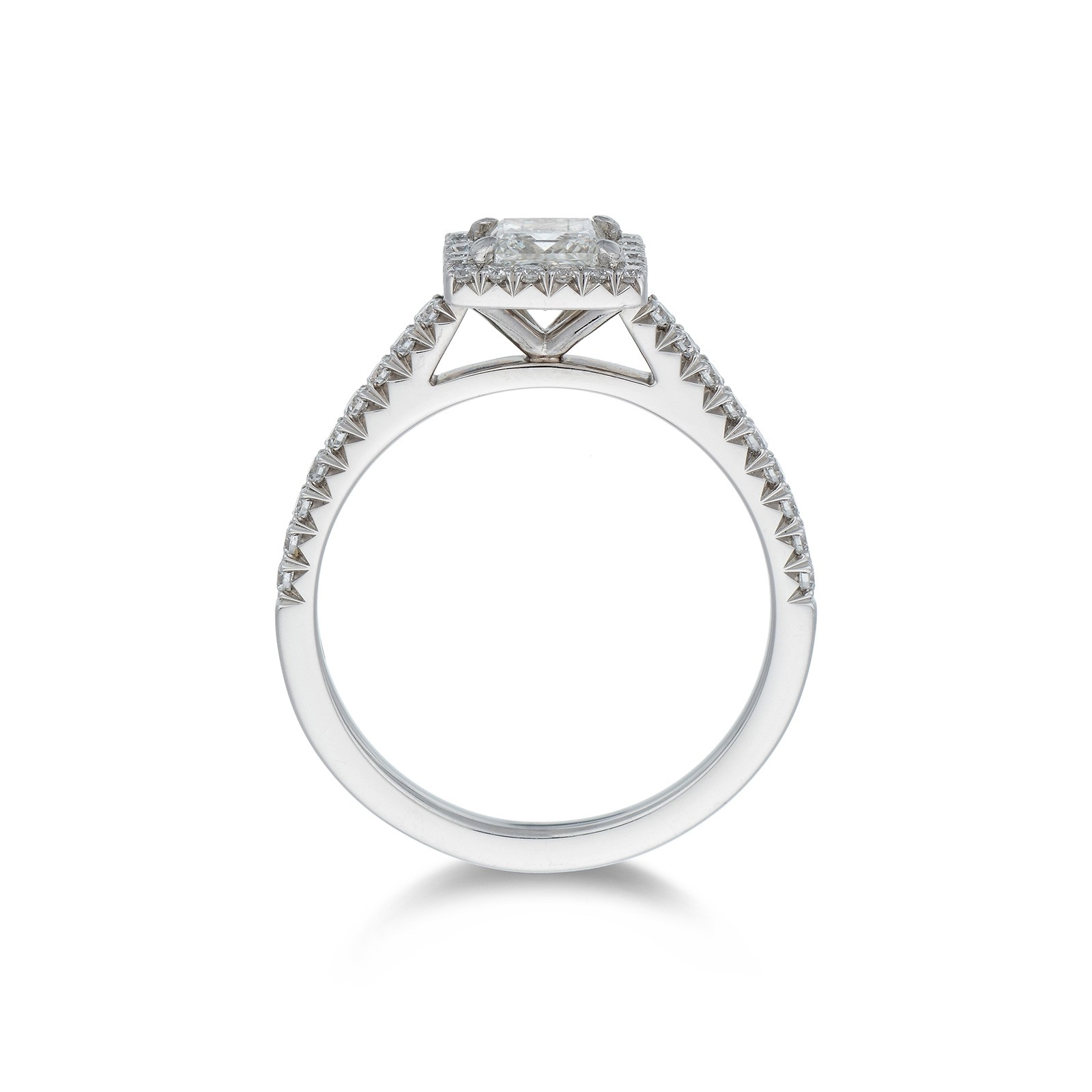 Platinum 0.50ct princess cut diamond solitaire with french cut diamond shoulders and halo total weight 0.85ct