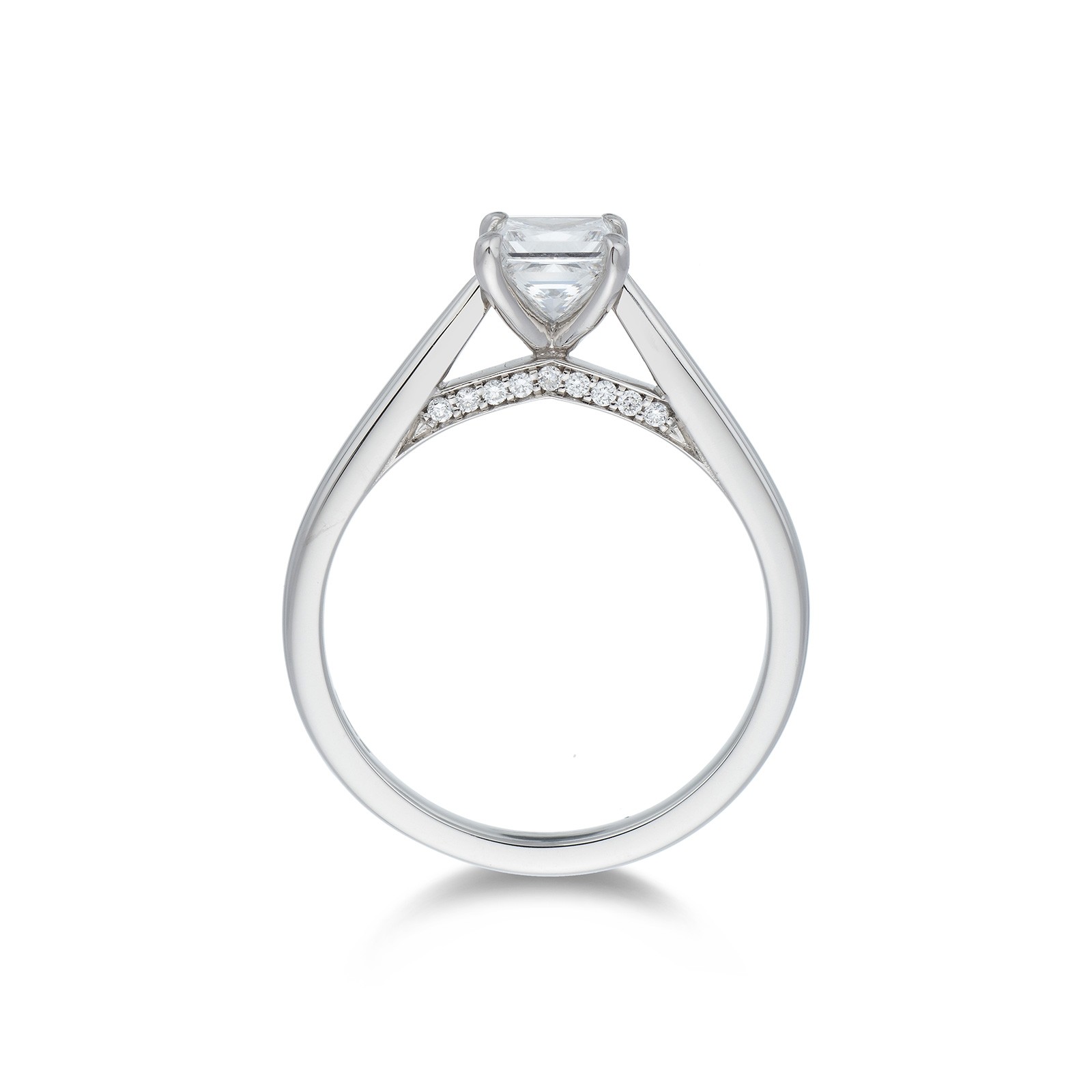 Platinum 0.75ct high v-shape princess cut with diamond detailing total weight 0.85ct
