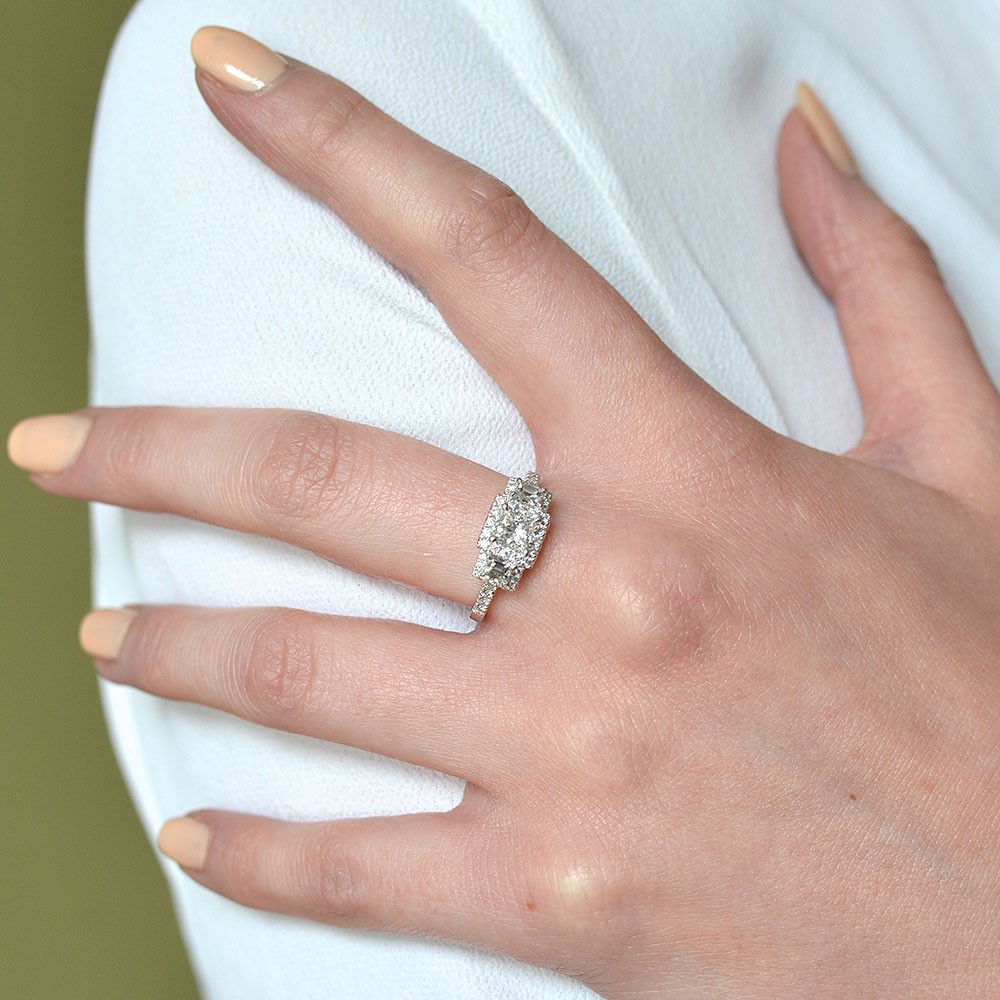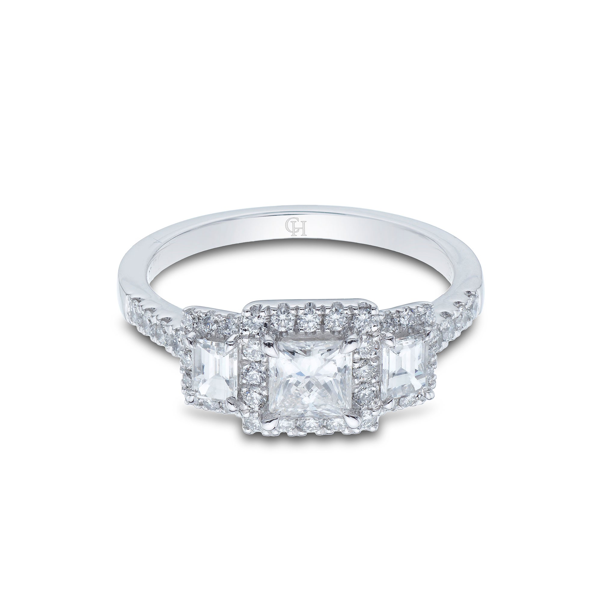 Define timeless romance with this platinum princess cut three stone diamond engagment ring. Enhanced by a sparkling halo of brilliant cut diamonds and diamond set shoulder. Certain to steal your loved one's heart and exclusive to Chisholm Hunter, this ring has an total diamond carat weight of 1.20.