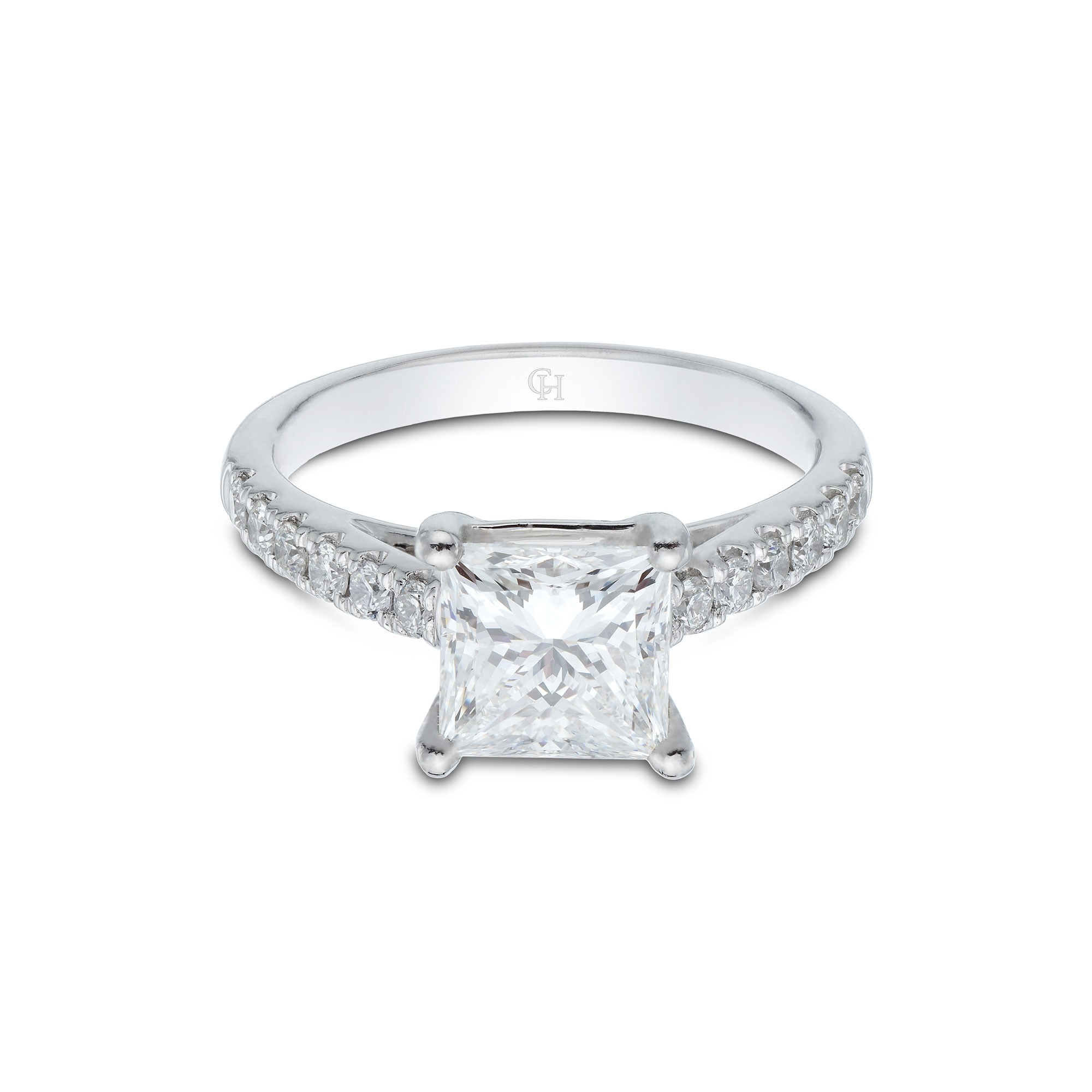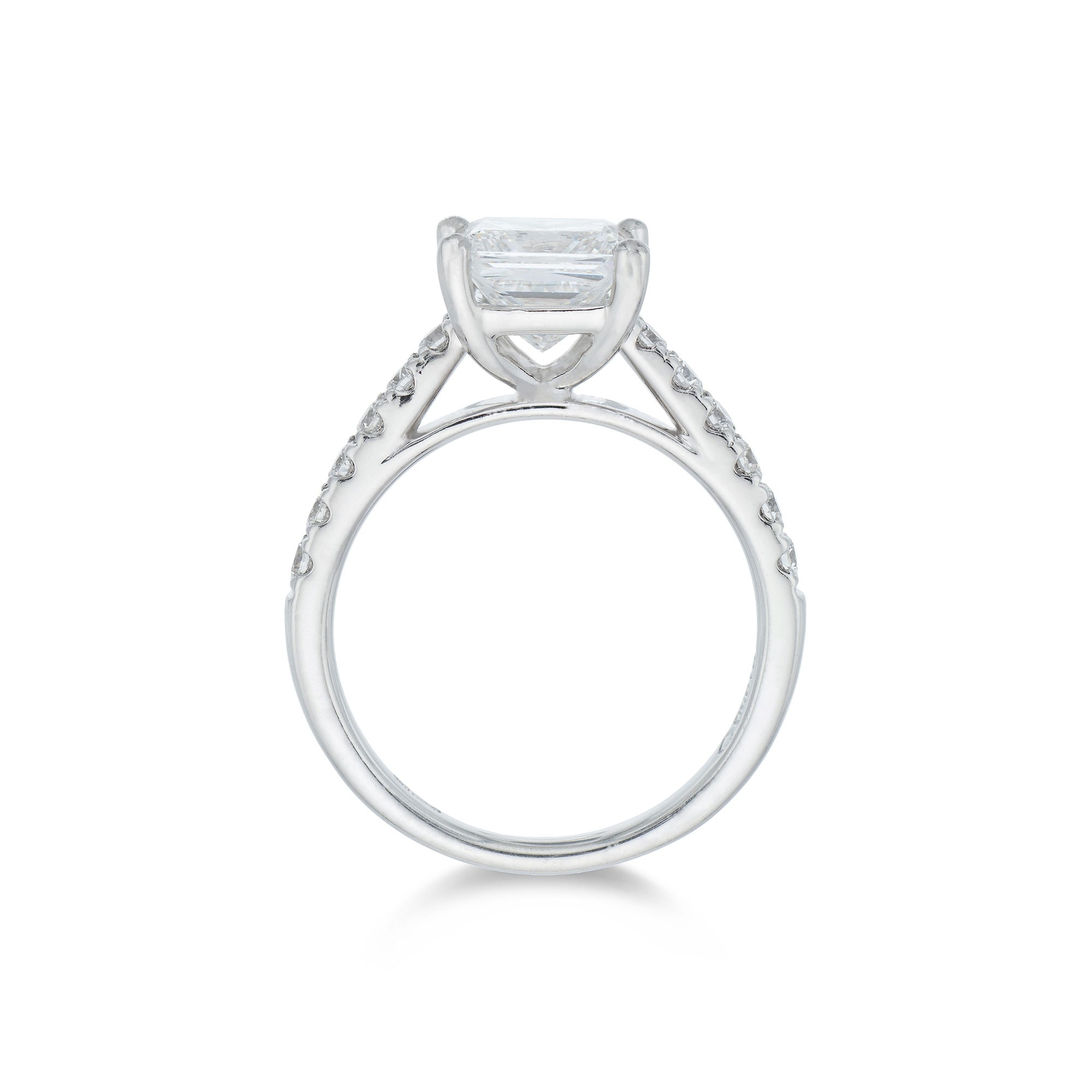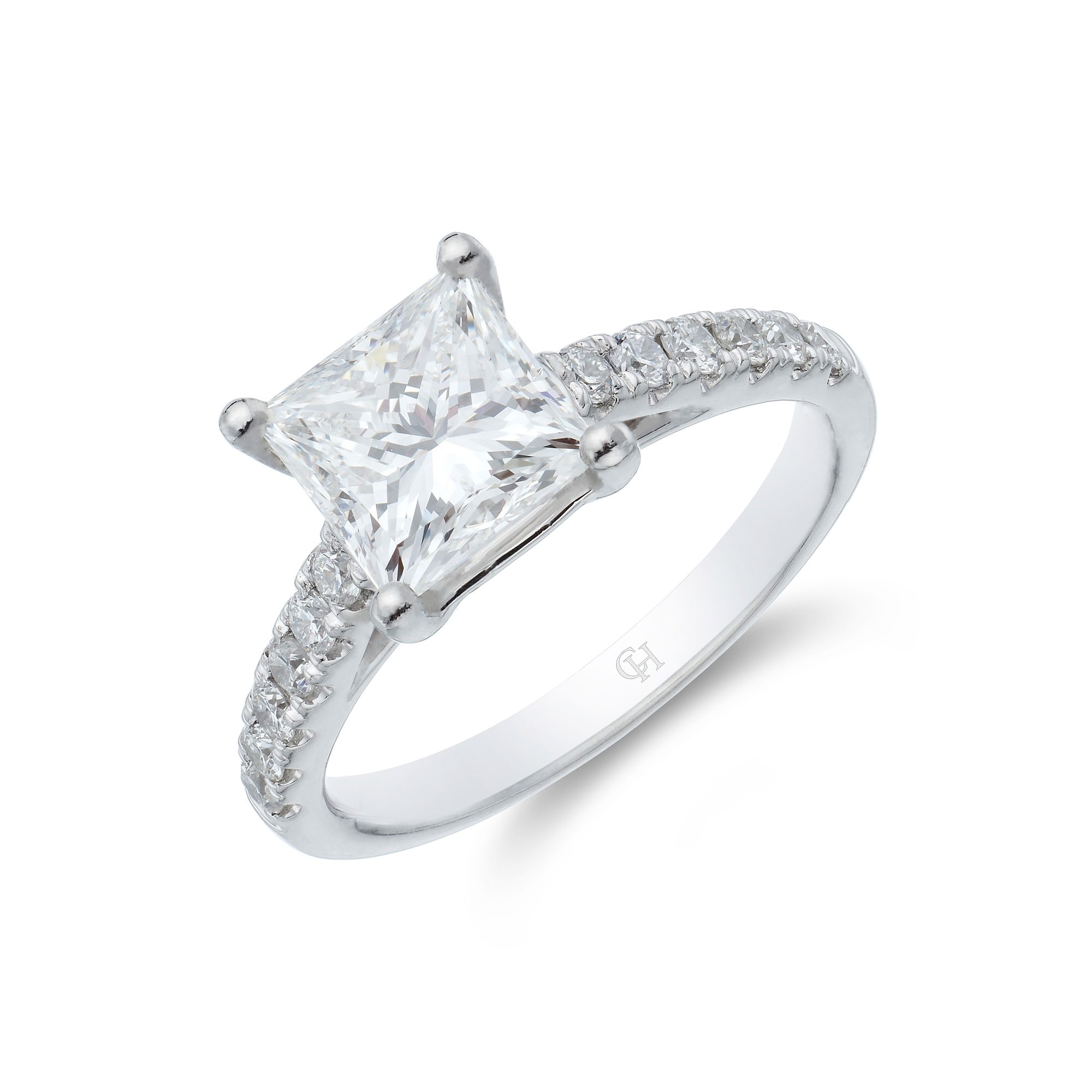 Make your special moment memorable with this Platinum Princess Cut 2.00ct Diamond Solitaire Ring. The classic princess cut diamond is emphasised by sparkling pavé diamond shoulders. This engagement ring will be cherished by your loved one and admired by all. Diamond Information: Cut-Princess, Colour-F, Clarity-VS2, Weight-2.06.