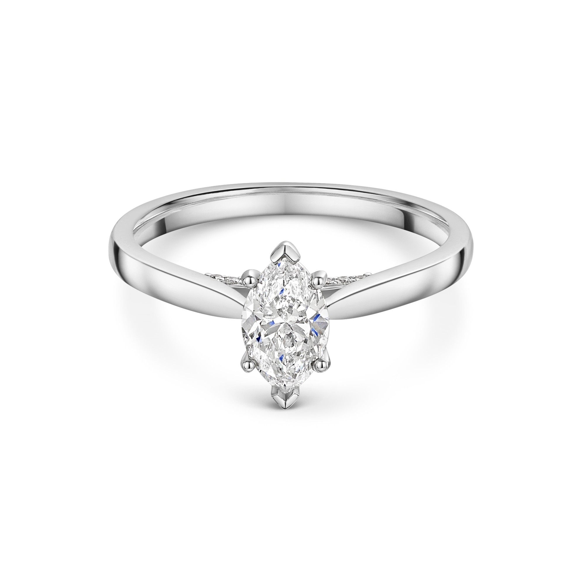 Presenting the Platinum V-Shape Marquise 0.75ct Diamond Solitaire with Diamond Accents from Chisholm Hunter. This exquisite ring features a stunning marquise-cut diamond, set in premium platinum for unmatched durability and timeless beauty.