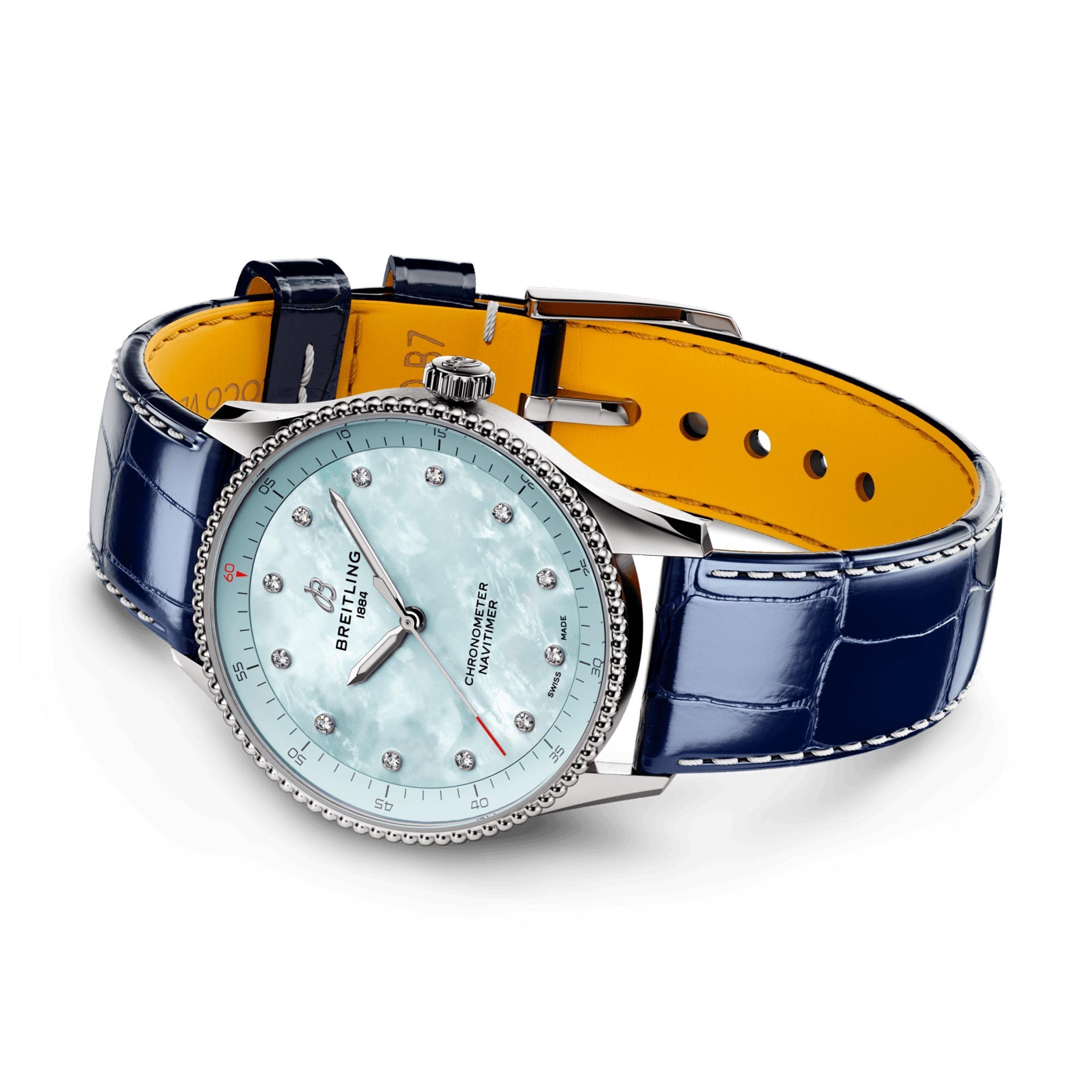 The mesmerising blue mother of pearl face creates a stunning contrast against the silver case, making this timepiece truly eye-catching. The round shape complements any outfit, while the Breitling 77 movement guarantees utmost accuracy.