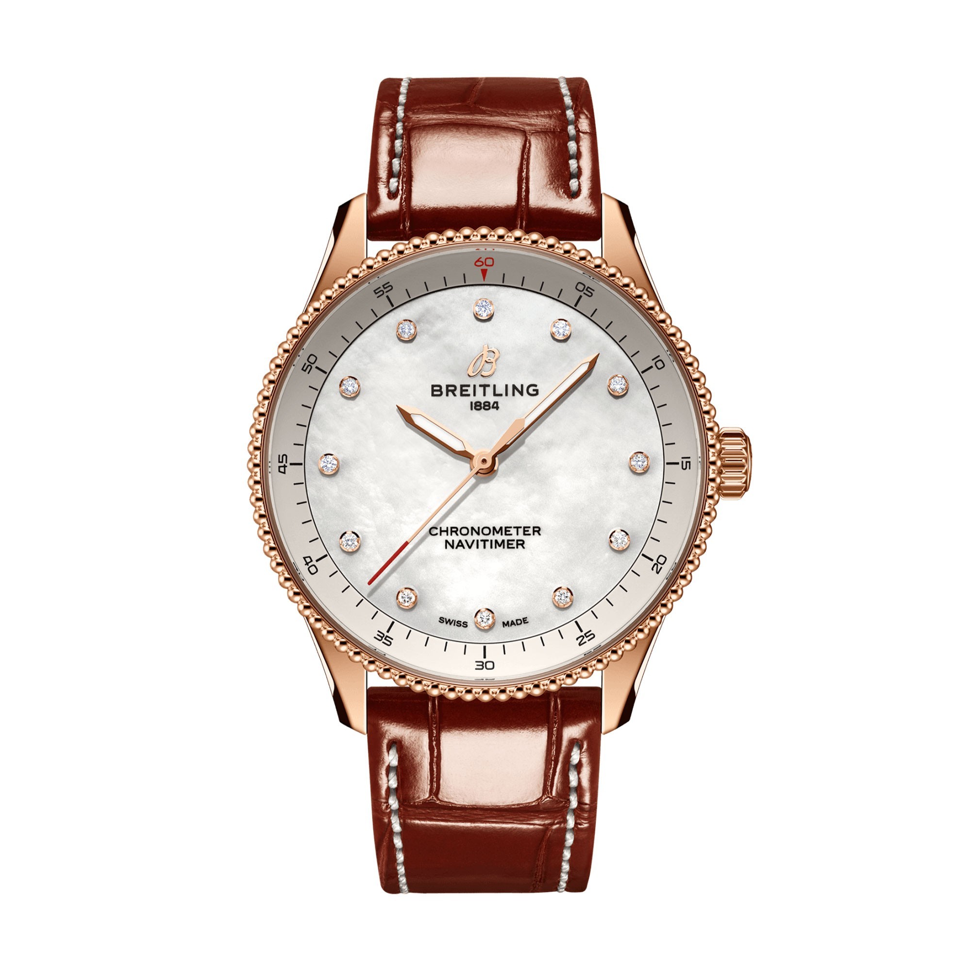 Explore the exquisite craftsmanship of the Pre-Owned Breitling Navitimer Quartz 32mm Ladies Watch R77320E61A1P1. Designed for her, this timepiece merges functionality with elegance. The 32mm round case, crafted from 18ct rose gold, radiates a warm glow while ensuring durability.
