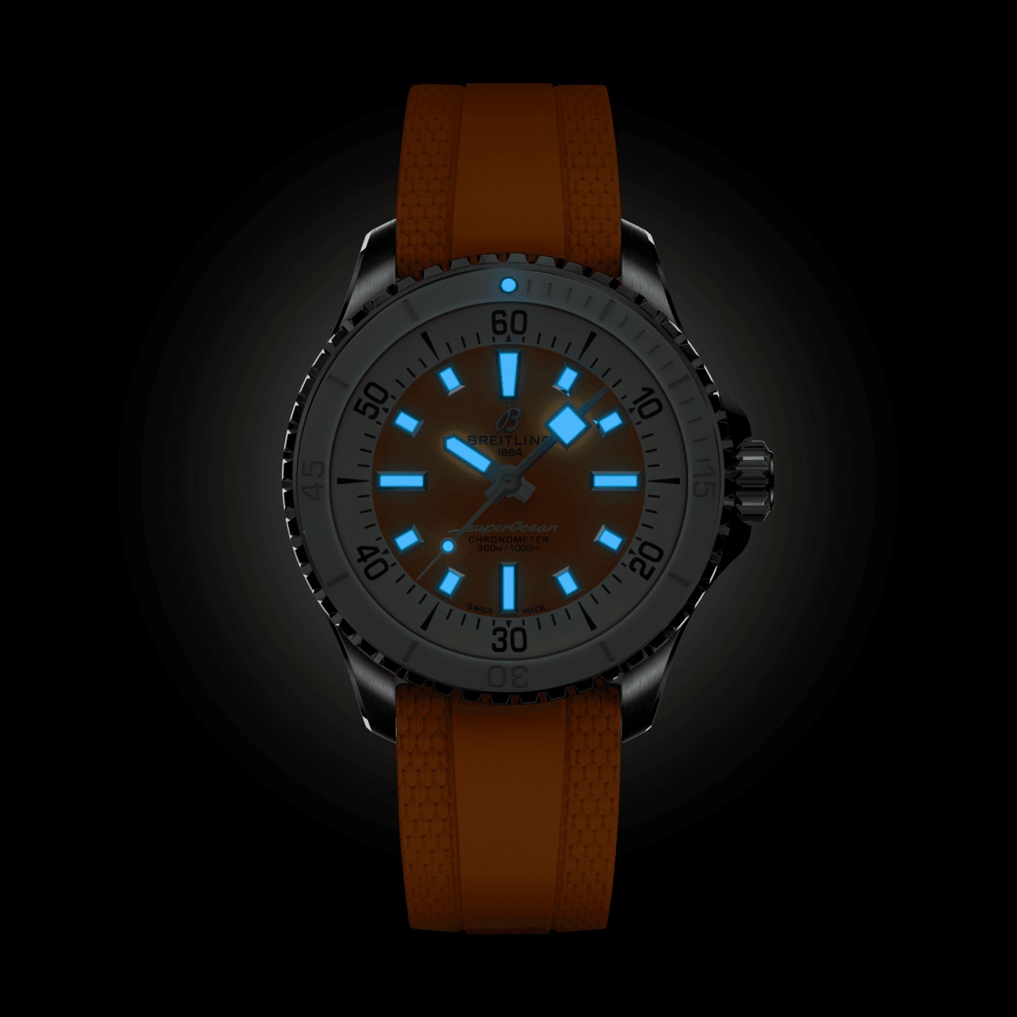 The new Superocean retraces the Slow Motion's celebrated design codes, while adding modern features, like a ceramic-inlayed bezel and brightly coloured dials. Broad hands and indexes in luminescent Super-LumiNova® allow for easy readability underwater. The watch is water resistant to 300 m (1000 ft), as well as being shock, sand and saltwater-resistant.
