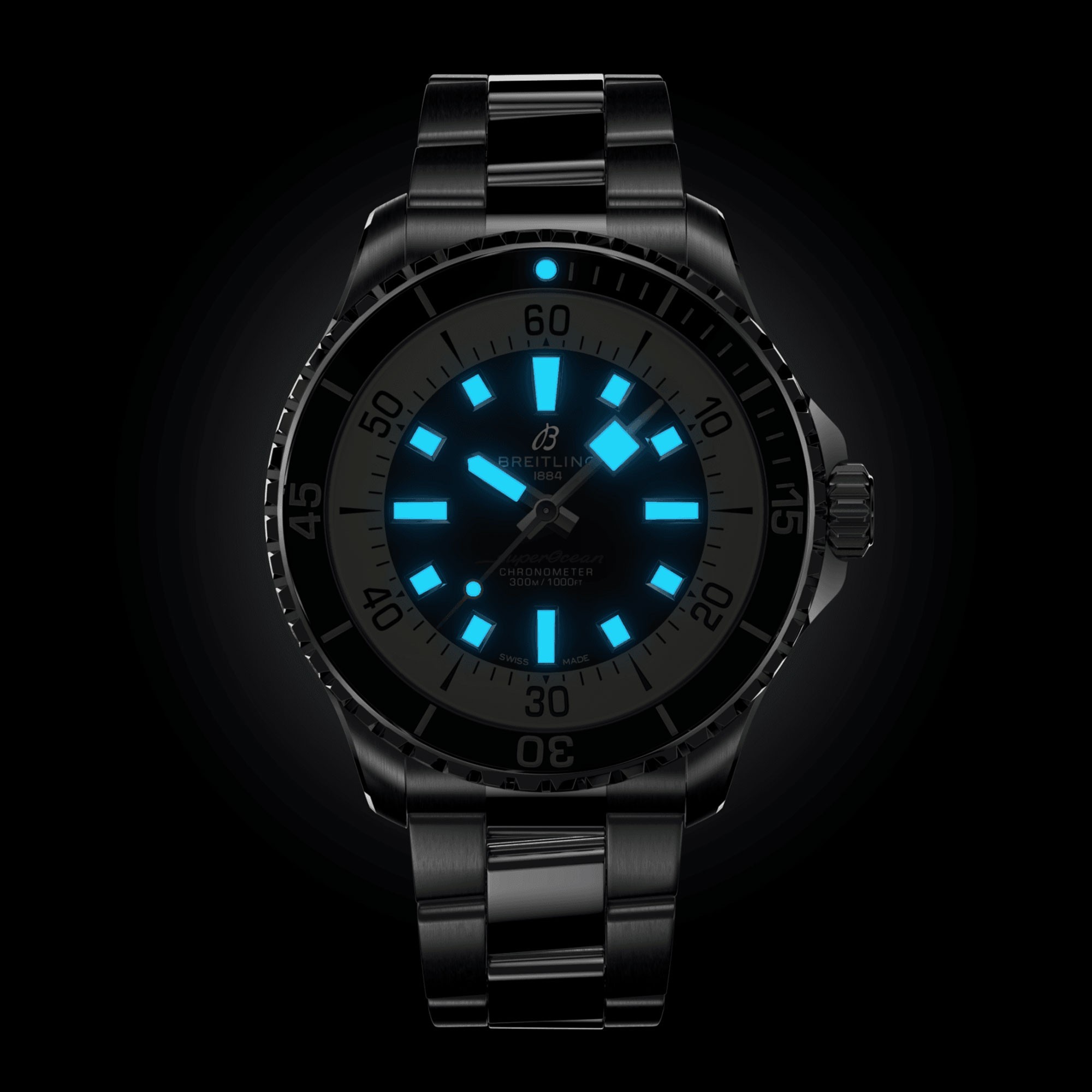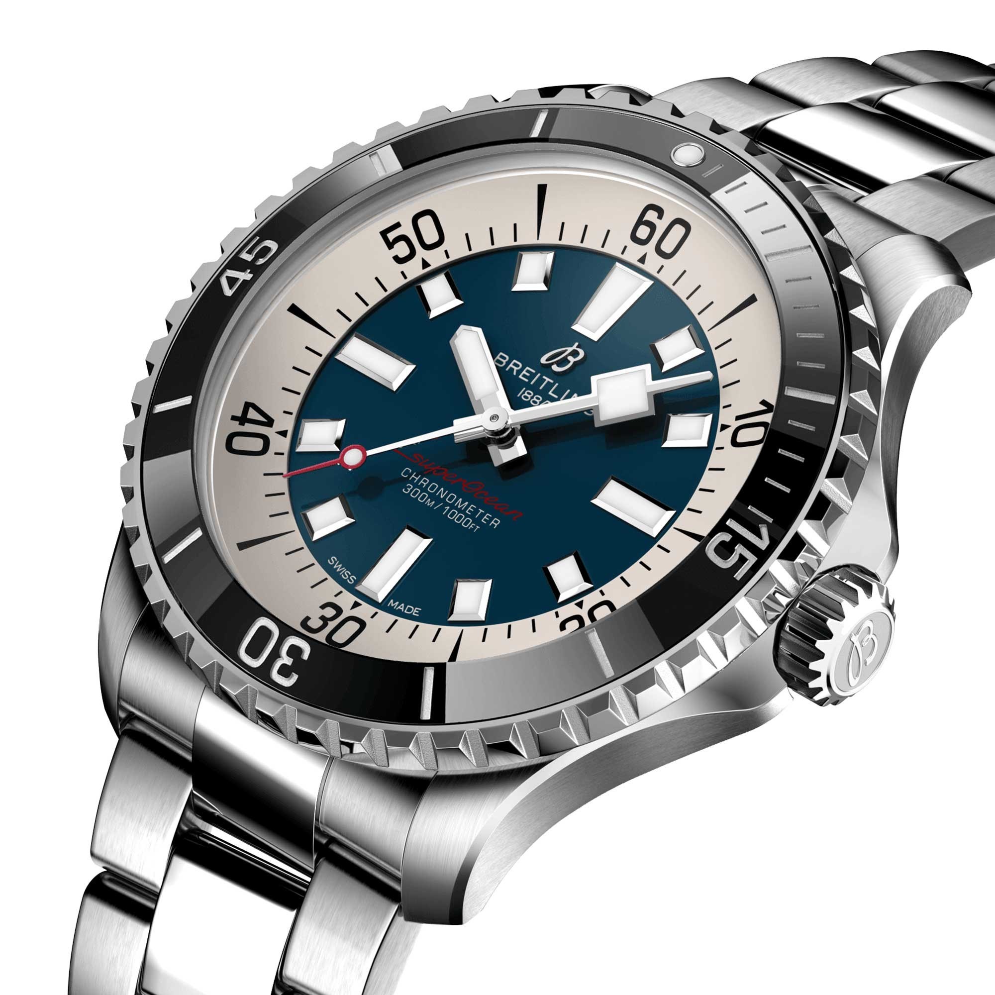 This pared-down watch was named the Slow Motion. What remained were clean lines, chunky luminescent indexes, squared-off hands and a high-contrast dial ring, all aimed at maximum legibility. Practical, yes. But what people really fell in love with was the look. The new Superocean retraces the Slow Motion's celebrated design codes, while adding modern features, like a ceramic-inlayed bezel and brightly coloured dials. Broad hands and indexes in luminescent Super-LumiNova® allow for easy readability underwater. The watch is water resistant to 300 m (1000 ft), as well as being shock-, sand- and saltwater-resistant.