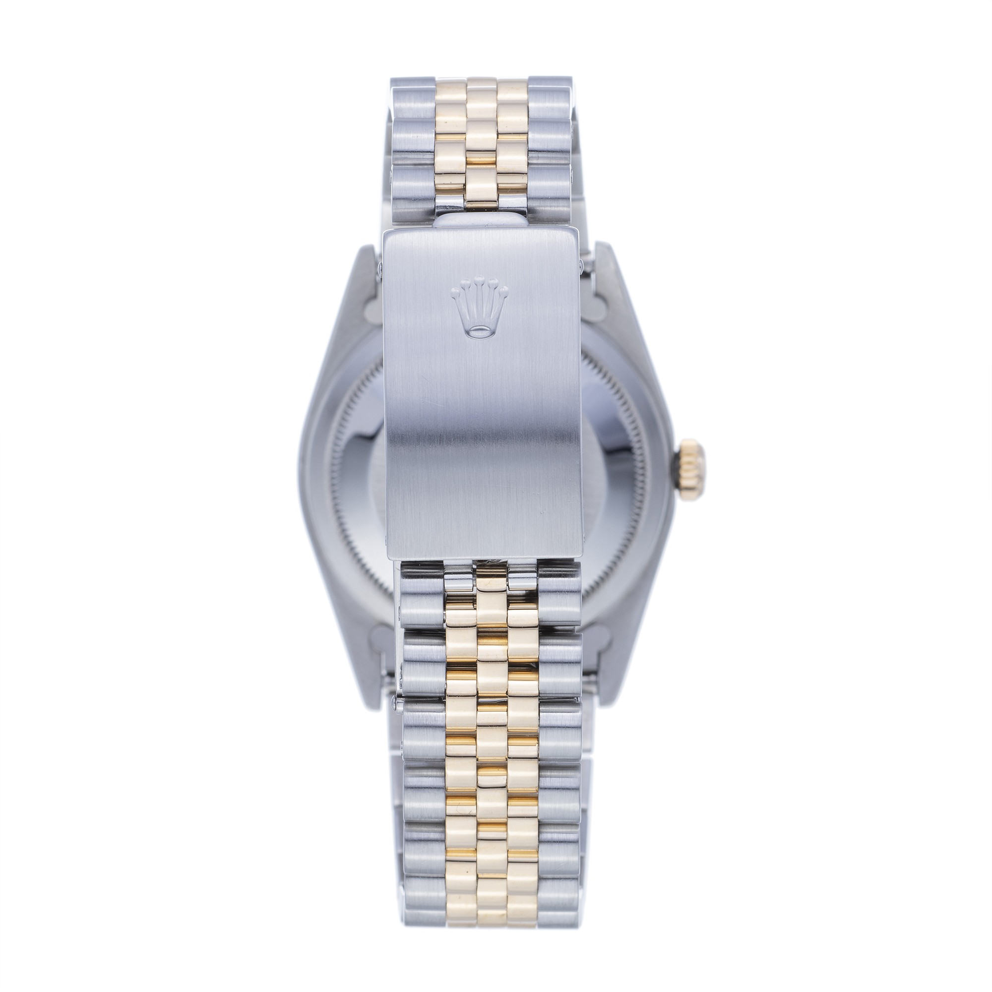 The Pre-Owned Gents Rolex Datejust Watch 16233 pairs timeless design with day-to-day utility. This 36mm reference 16233 features a black dial with diamond dot hour markers and the signature date display. The stainless steel and gold case and bracelet deliver classic silver and gold tones with the iconic two-tone look.