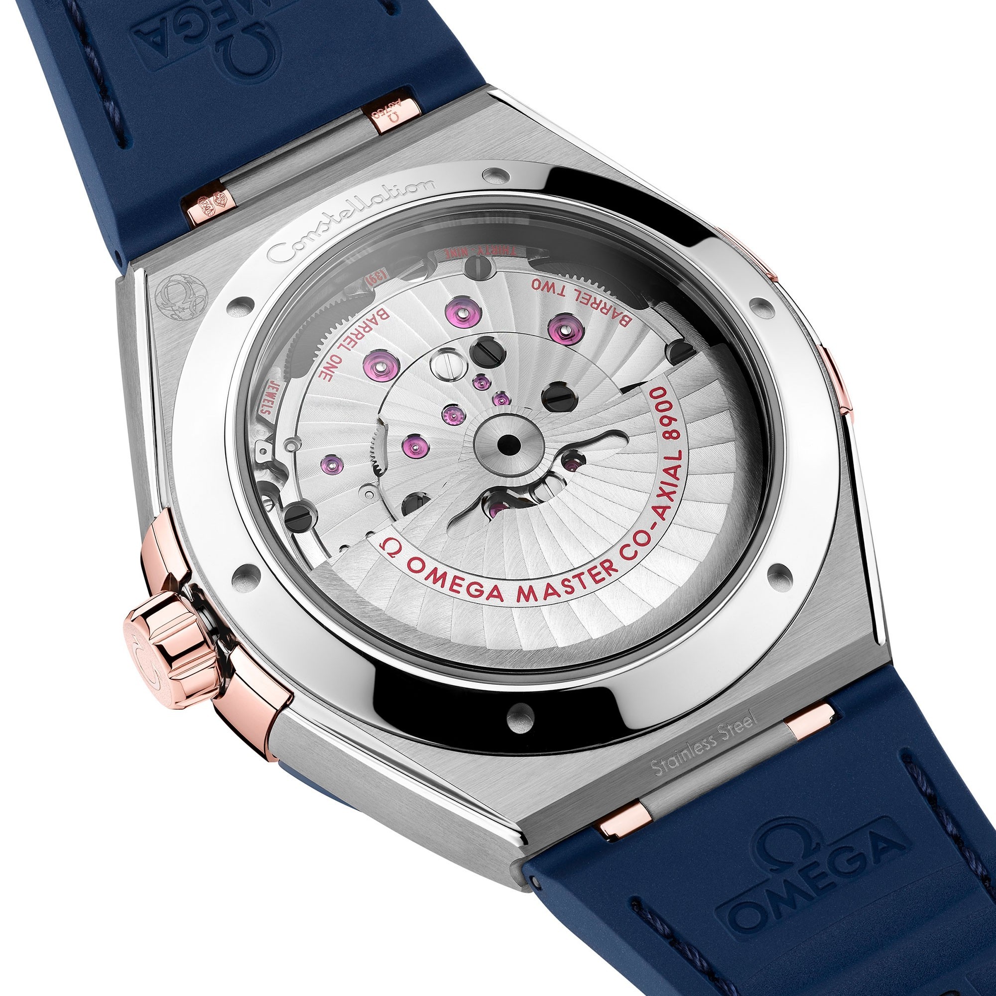 Presented on a blue leather strap with rubber lining, this timepiece is driven by the OMEGA Co-Axial Master Chronometer Calibre 8900, visible through the domed scratch-resistant sapphire crystal.