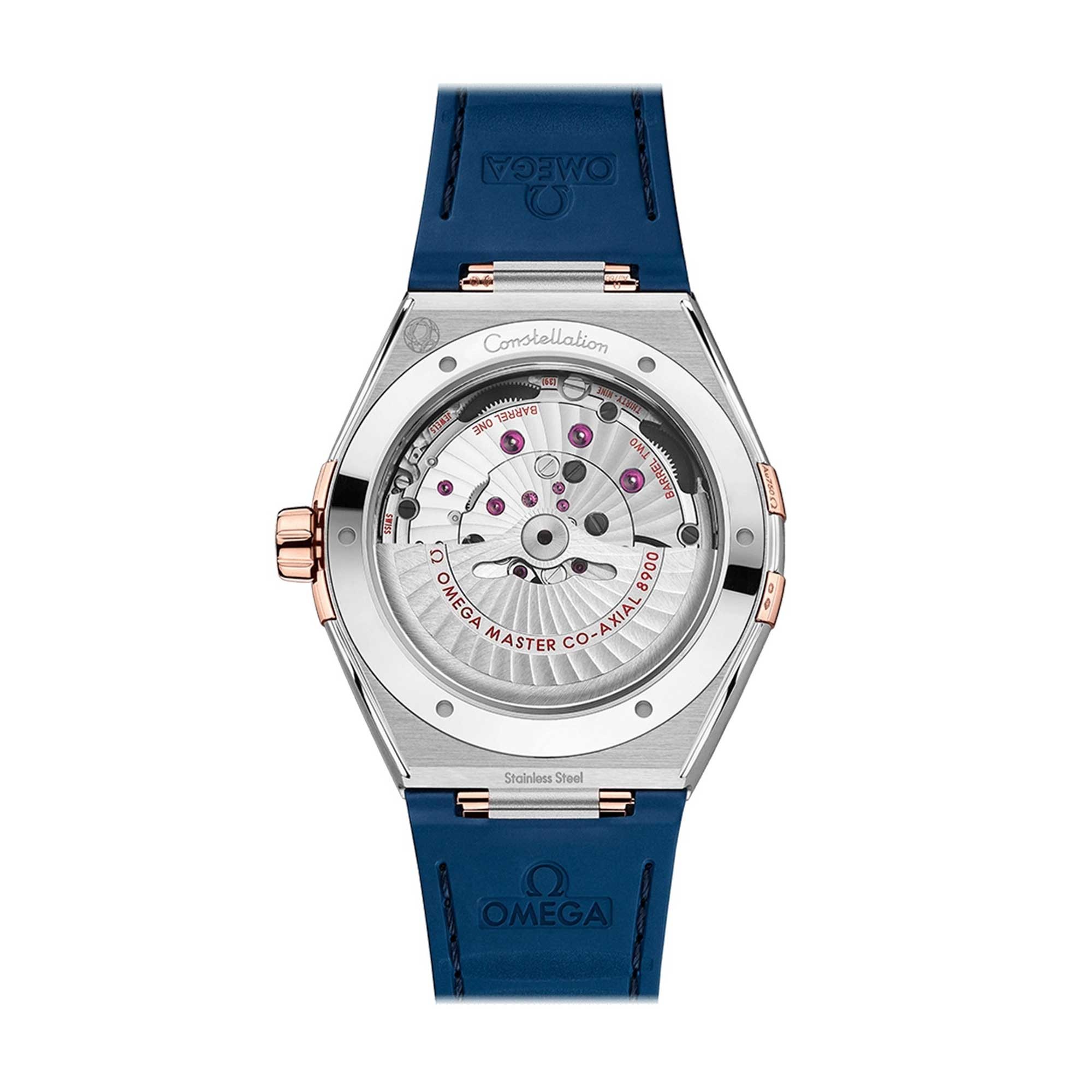 Presented on a blue leather strap with rubber lining, this timepiece is driven by the OMEGA Co-Axial Master Chronometer Calibre 8900, visible through the domed scratch-resistant sapphire crystal.