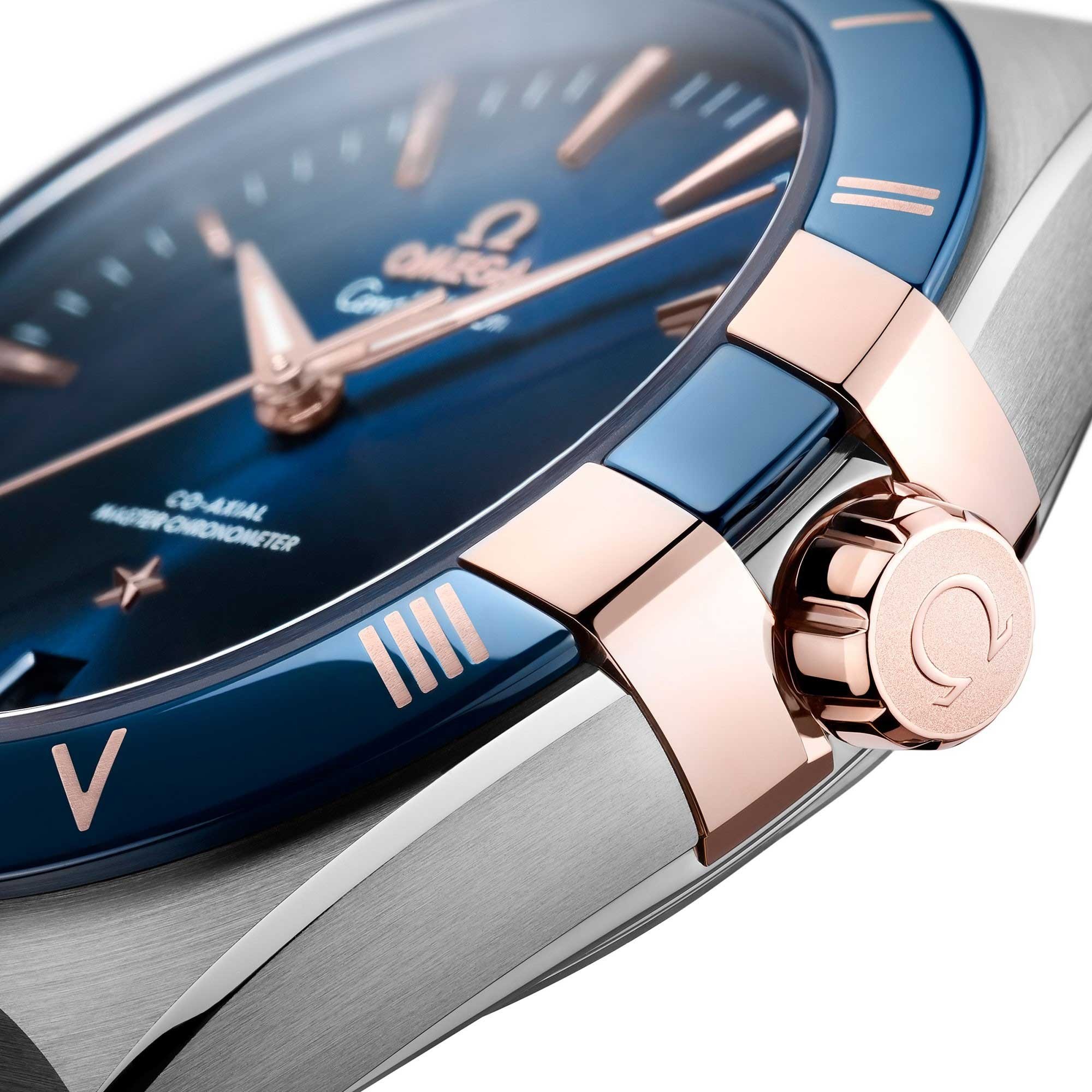 This pre-owned 41 mm stainless steel and 18K Sedna™ gold model features a polished blue ceramic bezel with Roman numerals in Ceragold™, a sun-brushed blue dial and a date window at the 6 o'clock position. The hands, OMEGA logo, Constellation star and facetted indexes are all in 18K Sedna™ gold.
