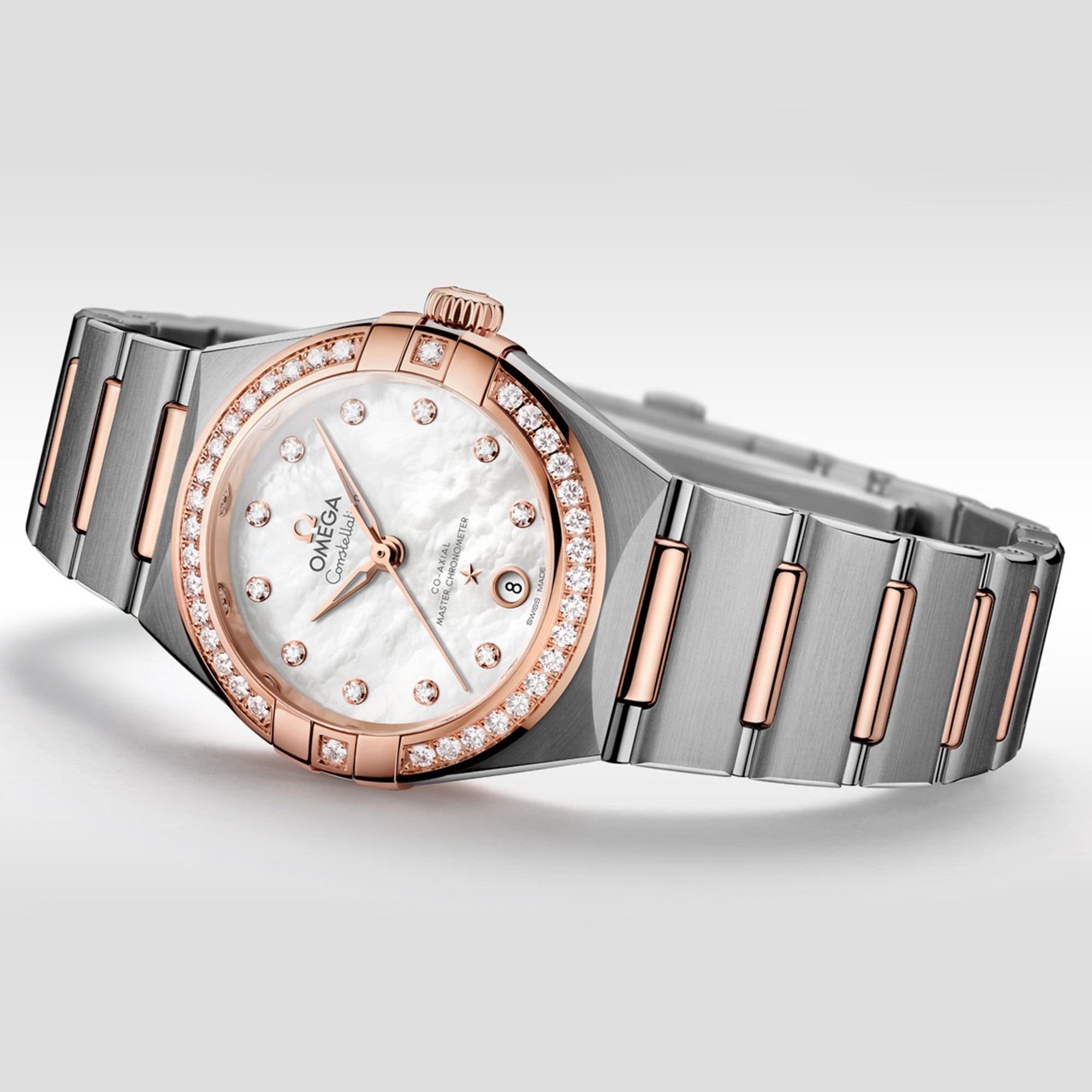 The hands, OMEGA logo, Constellation star and diamond holders are also in 18K Sedna™ gold. At the heart of this timepiece is the OMEGA Co-Axial Master Chronometer Calibre 8700, visible through the domed scratch-resistant sapphire crystal. Water resistant to 50m.