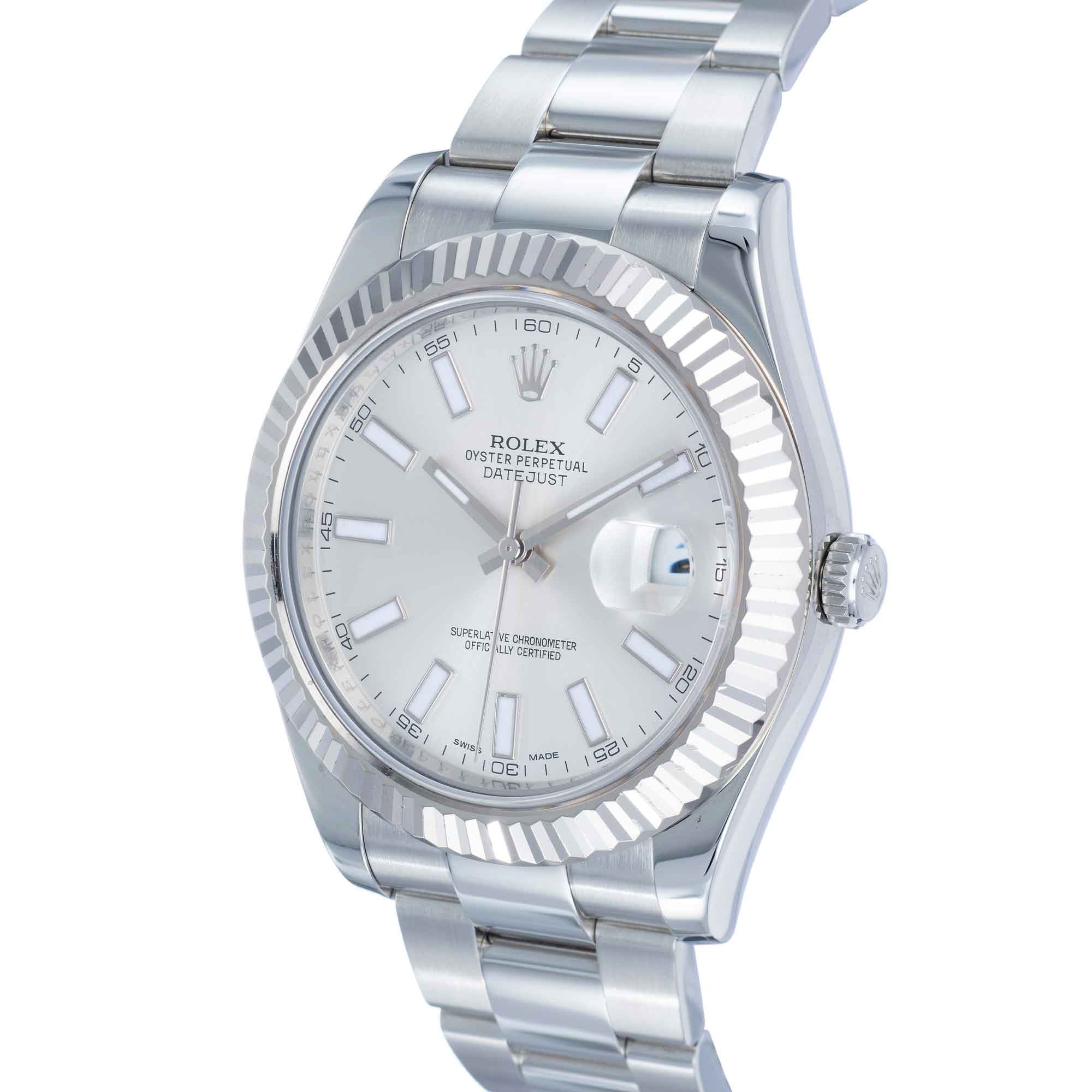 This Pre-Owned Rolex Datejust II 41mm Gents Watch 116334, Rolex offers timeless elegance fused with precision engineering. The automatic movement powers reliable timekeeping and the silver dial is styled with baton markers for crisp legibility. A sapphire crystal glass guards the dial against scratches and glare.
