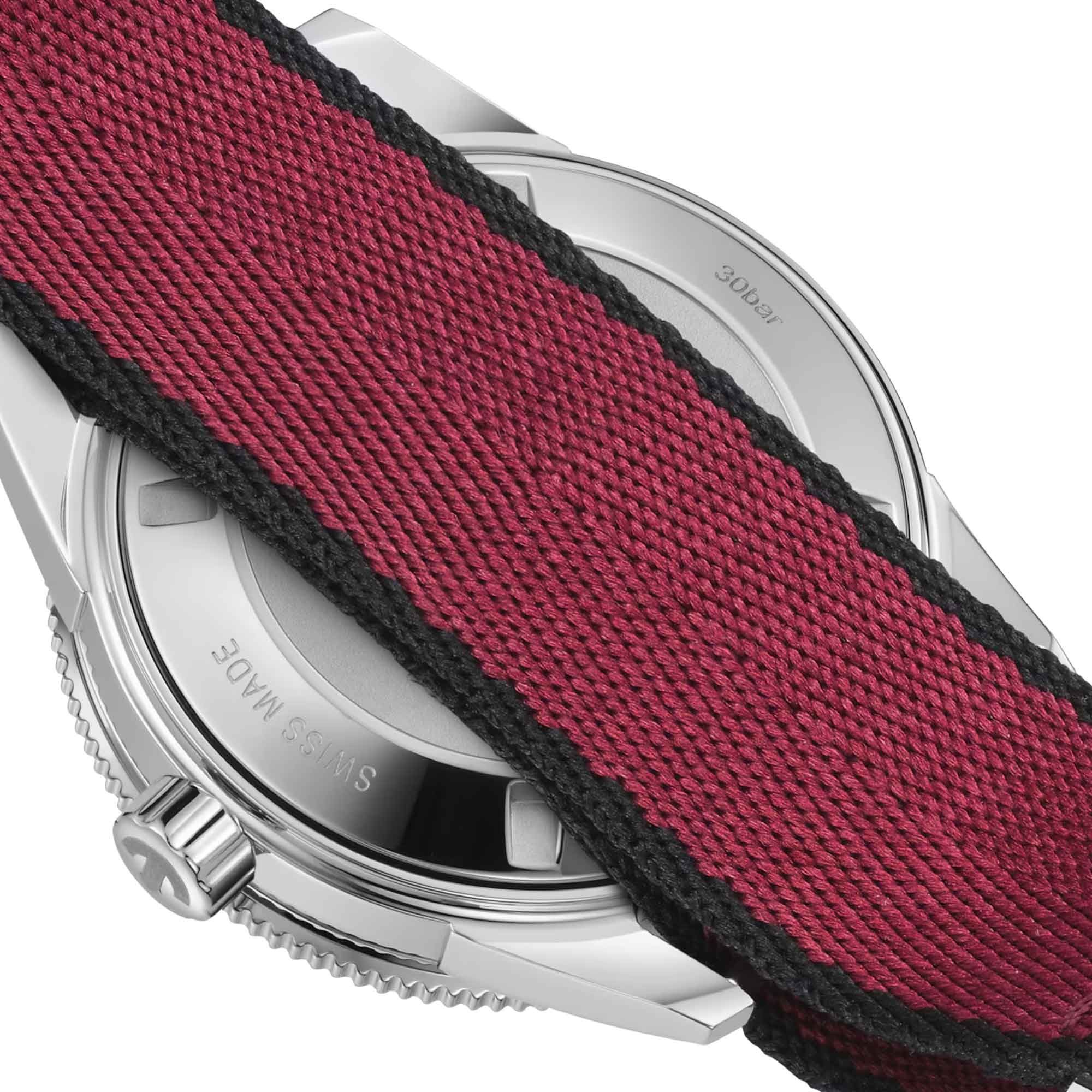 The 39mm stainless steel case fits comfortably on various wrist sizes, complementing the existing 37mm and 42mm versions. The watch is worn with a vintage-style rice grain stainless steel bracelet for classic occasions, easily exchanged for two additional straps: a burgundy NATO-style textile strap with black border, and a black leather strap, offering versatility for different occasions.