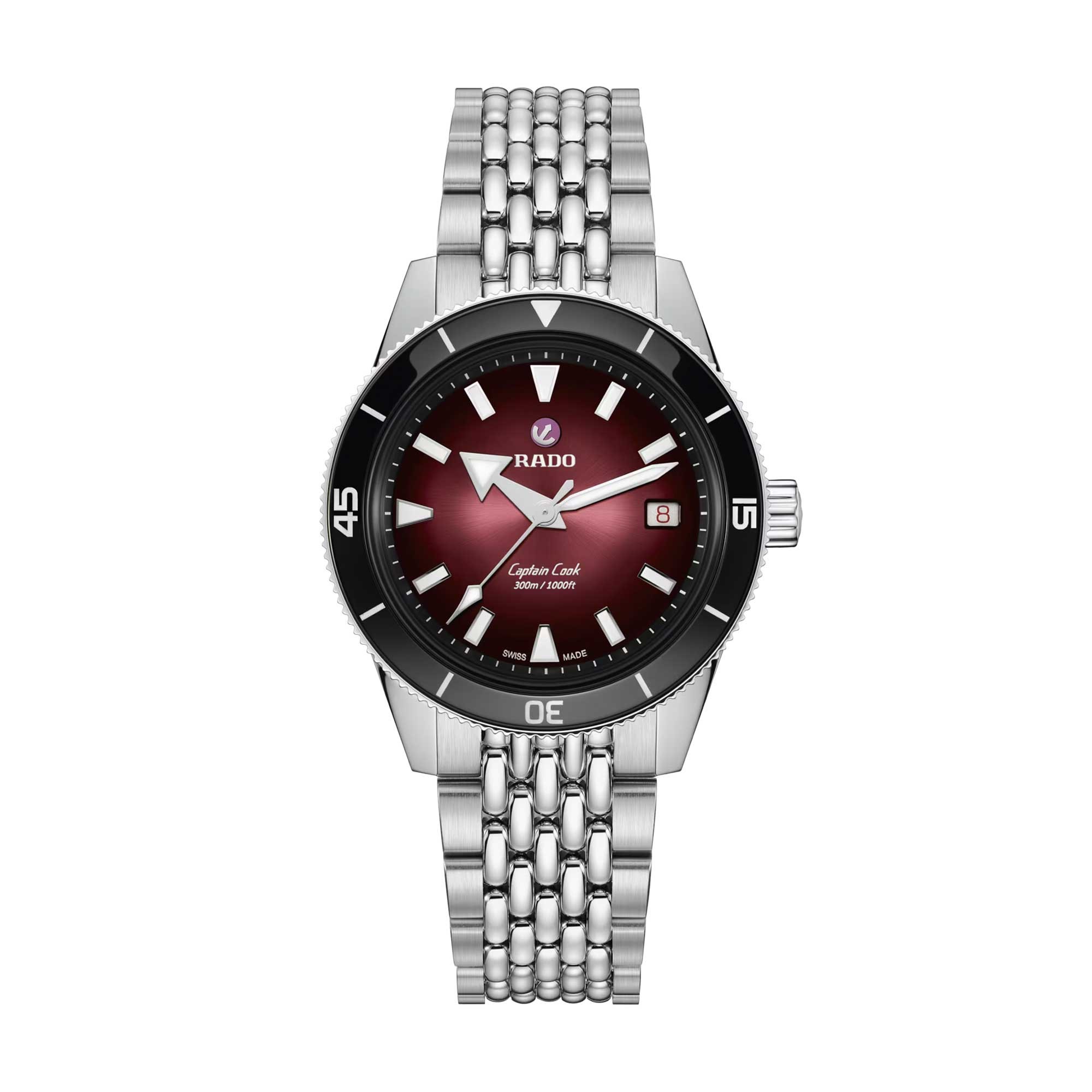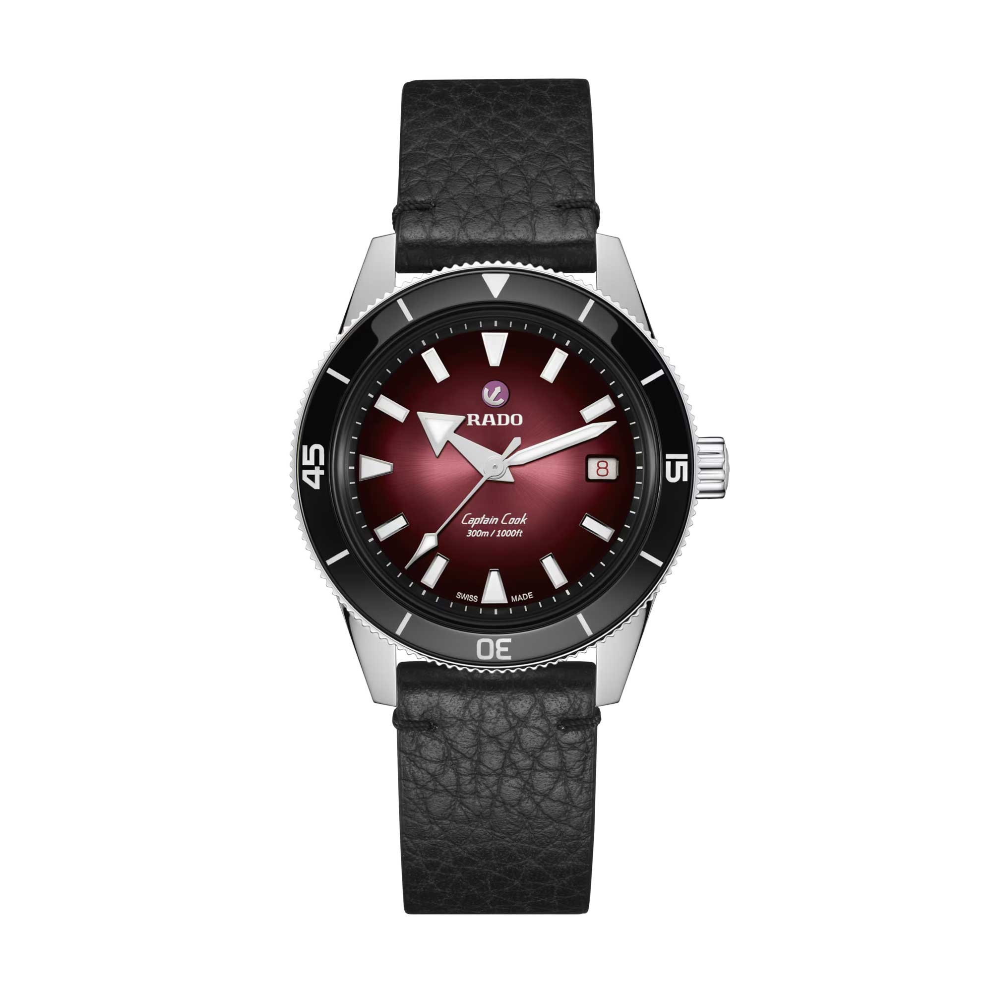 The Rado Captain Cook Automatic 39mm Men's Watch R32223408 offers a remarkable fusion of form and function, paying homage to the original 1962 model. Its black-to-burgundy gradient dial is shielded by a box-shaped sapphire crystal. The striking look is enhanced by rhodium-coloured applied indexes and hands with Super-LumiNova®, and by the polished black bezel insert in Rado’s signature high-tech ceramic.