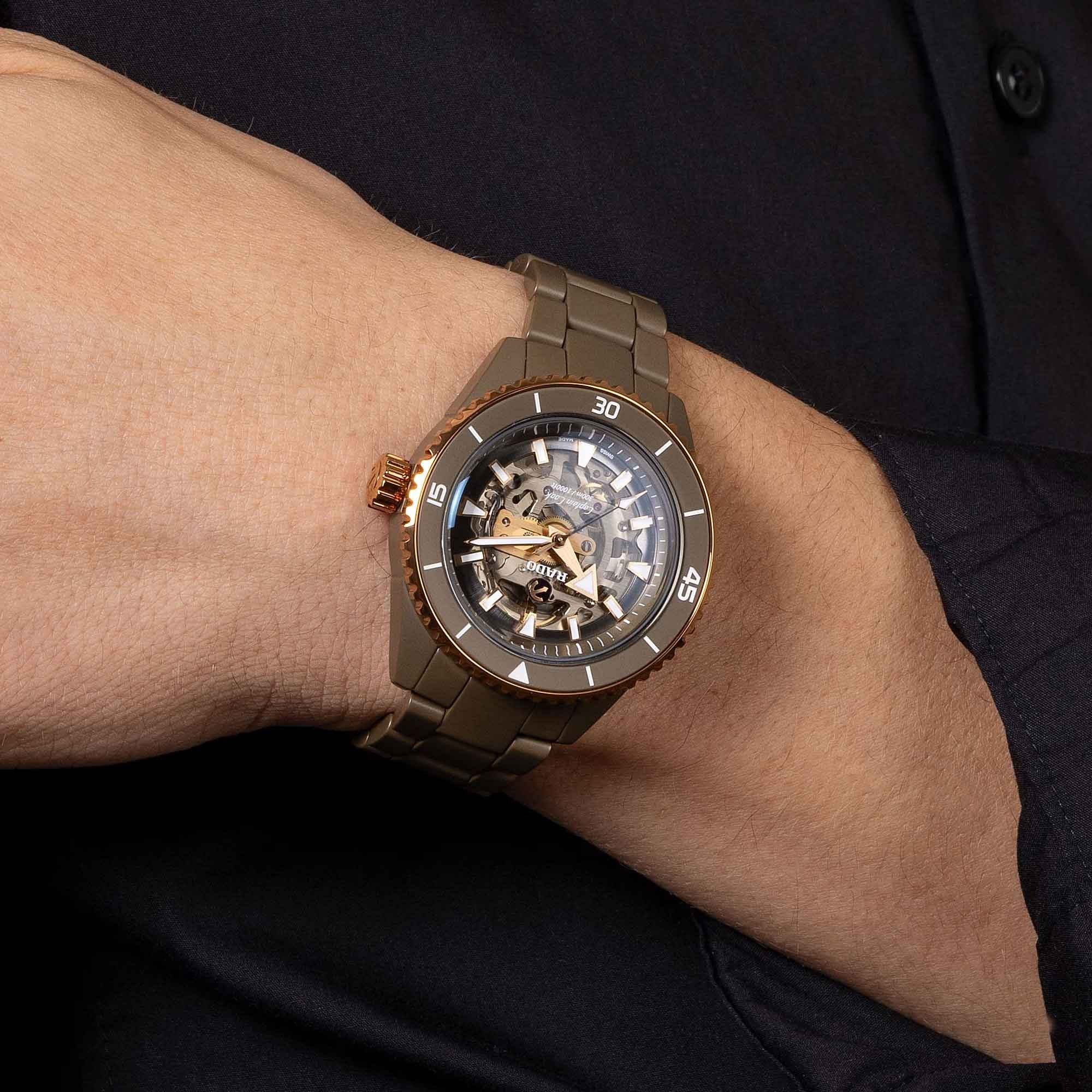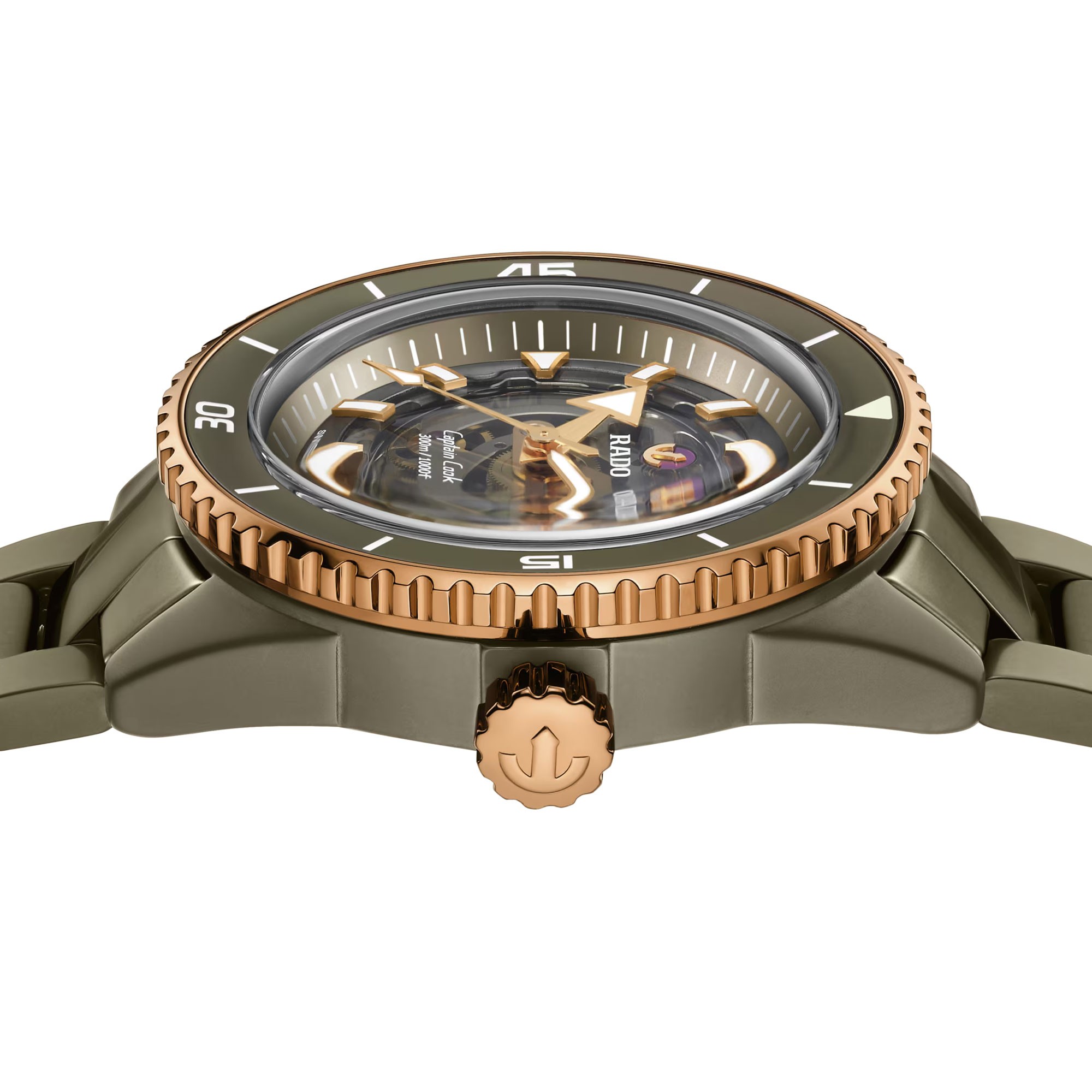 The Captain Cook High-Tech Ceramic Skeleton showcases its innovative R808 movement, a marvel of contrasts, know-how and clever geometry, that allows a distinct view of the various parts. It’s equipped with an anti-magnetic and highly reliable Nivachron™ hairspring that has been fully tested in five positions and provides up to 80 hours of power reserve. The superb matt olive-green high-tech ceramic monobloc case is topped by a rose-gold-colour rotatable bezel with a matt olive-green ceramic insert to match the case and lugs, for visual harmony. The dial is clear and spartan, with generous geometric indices and hour/minute/second hands in rose-gold tones, treated with white Super-LumiNova® for best readability in low-light conditions. Thanks to a matching olive green high-tech ceramic triple-row bracelet with a titanium three-fold clasp, the new Captain Cook remains loyal with you through the most rugged and demanding of your explorations.