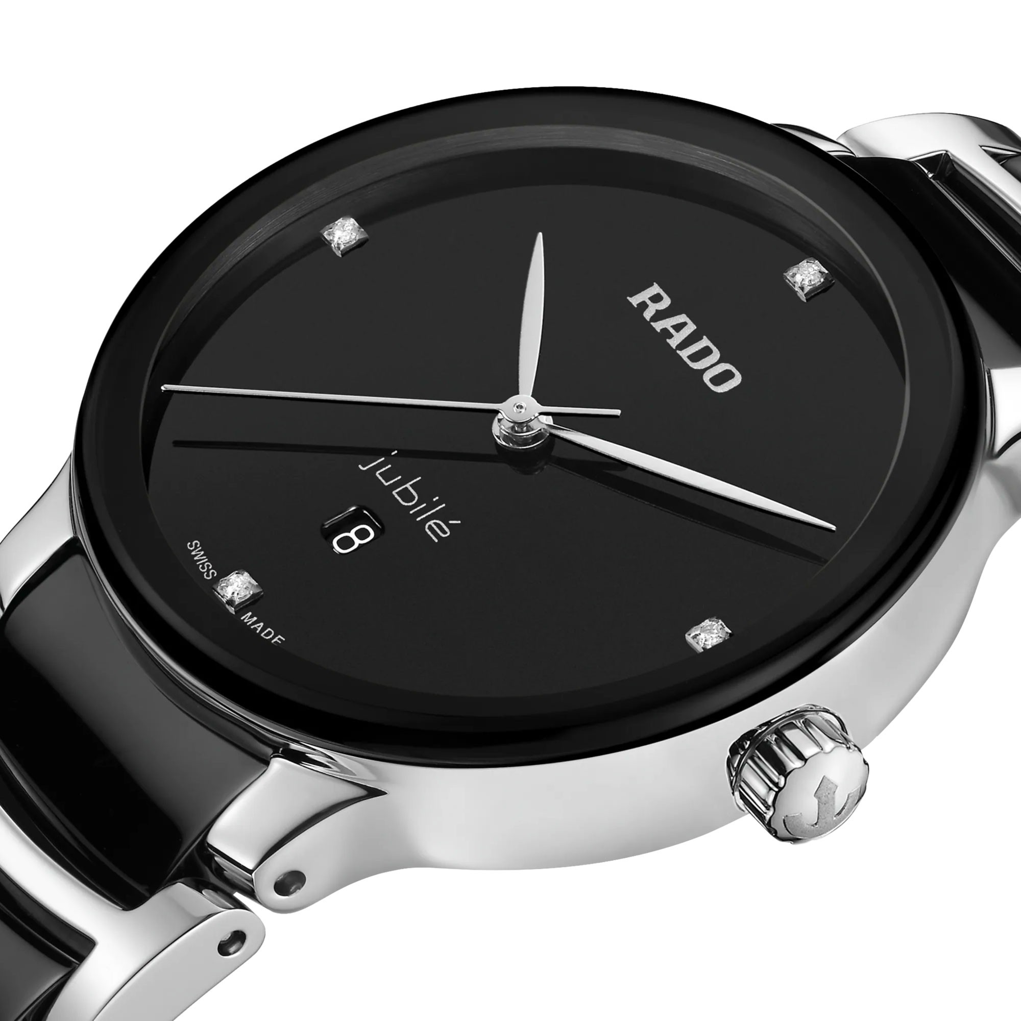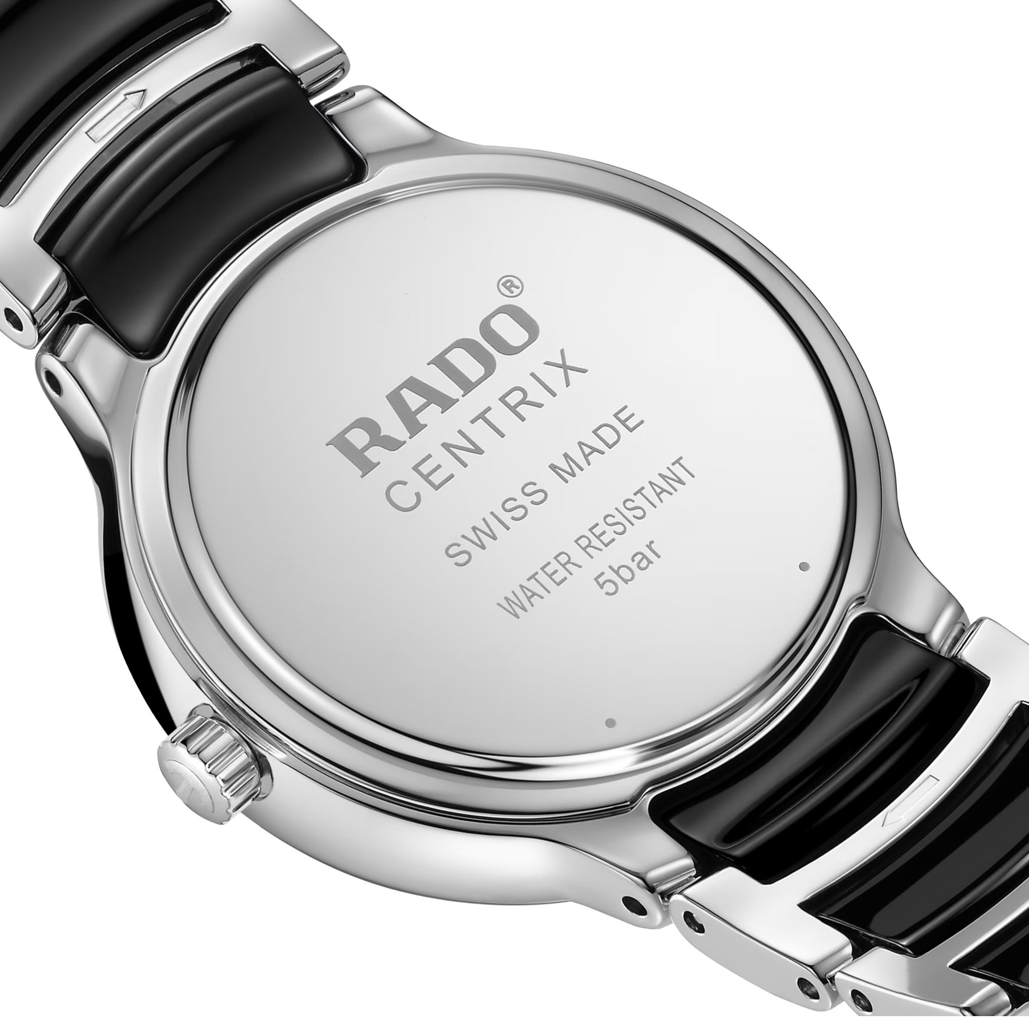 The Rado Centrix Collection showcases Rado watch design at its finest. With the use of innovated materials and owning a strong sense of style. This addition to the Swiss range features an elegant 28mm black ceramic case. The dial is in matching chic black with diamonds marking 12, 3, 6 and 9 o’clock. The clock hands are visible in silver and a date display window can be found at 6 o’clock. This is all powered by an accurate Swiss quartz movement housed within the watch. All materials have been designed to stand the test of time with Rado watches including the sapphire crystal glass that protects the dial and movement within. Designed to be beautiful forever. The look is completed by a high-tech black ceramic and brushed stainless steel bracelet. A deployment clasp makes this watch so easy to wear day or night. The bracelet can be adjusted in any of our Chisholm Hunter stores. This watch is water resistant up to 30 meters. Every Rado timepiece comes with a branded presentable box and a 2-year international warranty.