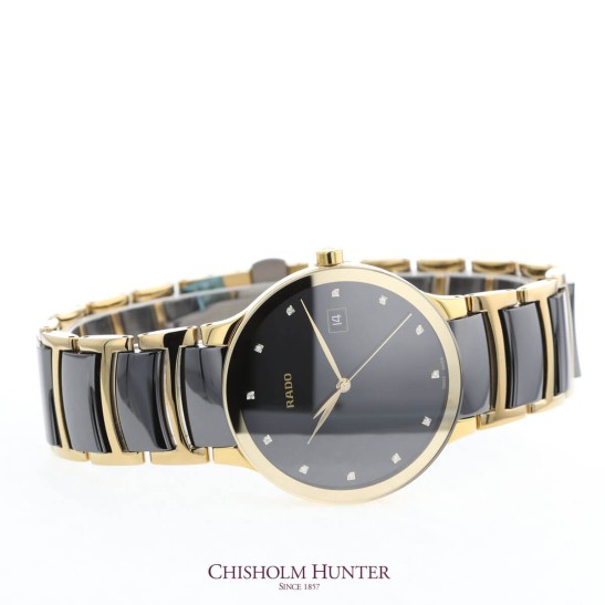 The Rado Centrix Collection showcases Rado watch design at its finest. Owning a strong sense of style and using innovated materials. This addition to the Swiss range features a 38mm stainless steel case with chic black dial. 12 luxurious diamonds mark each passing hour with yellow gold detail clock hands. This contemporary timepiece is perfect for the watch enthusiasts amongst us. A date display window can be found at 3 o’clock. All materials have been designed to stand the test of time in Rado watches including the sapphire crystal glass that protects the dial and accurate Swiss quartz movement within. Designed to be beautiful forever. The look is completed with a classic Rado bracelet in high tech black ceramic and stainless and yellow gold PVD stainless steel. A deployment clasp has been fitted for easy wear. The bracelet can be adjusted in any of our Chisholm Hunter stores by highly trained staff. This watch is water resistant up to 30 meters. Every Rado timepiece comes with a branded presentable box and a 2-year warranty.