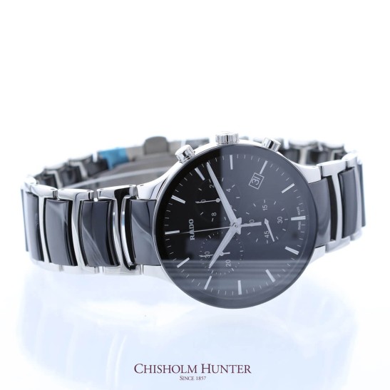 The Rado Centrex Collection showcases Rado watch design at its finest. Owning a strong sense of style and using innovated materials. This addition to the Swiss range features a masculine 44mm stainless steel case and classic Rado black dial. Featuring a chronograph function and date display at 4 o’clock. Silver and white accents on the face give a contemporary, high fashion look. Batons and clock hands stand out against the black in white and silver. A trio of sub dials and date display window look chic with black on black and white accents make them easily readable. The timepiece is powered by an accurate Swiss quartz movement. All materials have been designed to stand the test of time in Rado watches including the sapphire crystal glass that protects the dial and movement within. Designed to be last forever. The contemporary look is completed by a matching high-tech black ceramic and stainless-steel bracelet. Fit with a deployment clasp for easy wear. The bracelet can be adjusted in any of our Chisholm Hunter stores by highly trained staff. This watch is water resistant up to 50 meters. Every Rado timepiece comes with a branded presentable box and a 2-year warranty.