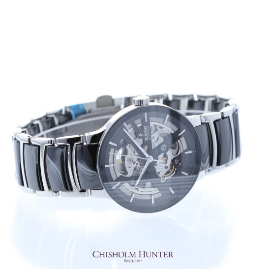 The Rado Centrix Collection showcases Rado watch design at its finest. Owning a strong sense of style and using innovated materials. This addition to the Swiss range features a 38mm black ceramic scratch resistant case. The dial features a stunning, black, open heart face. Admire the beauty and sophistication of the Swiss automatic movement through your timepiece. Silver batons and hands mark the passing of time. All materials have been designed to stand the test of time in Rado watches including the sapphire crystal glass that protects the dial and accurate Swiss automatic movement within. Designed to be last forever. Admire the beautiful movement of your watch through sapphire crystal glass at the back of the case as well as through the skeleton face. The look is completed with a high-tech black ceramic and stainless-steel bracelet with easy use folding clasp. The bracelet can be adjusted in any of our Chisholm Hunter stores by highly trained staff. This watch is water resistant up to 30 meters. Every Rado timepiece comes with a branded presentable box and a 2-year warranty.