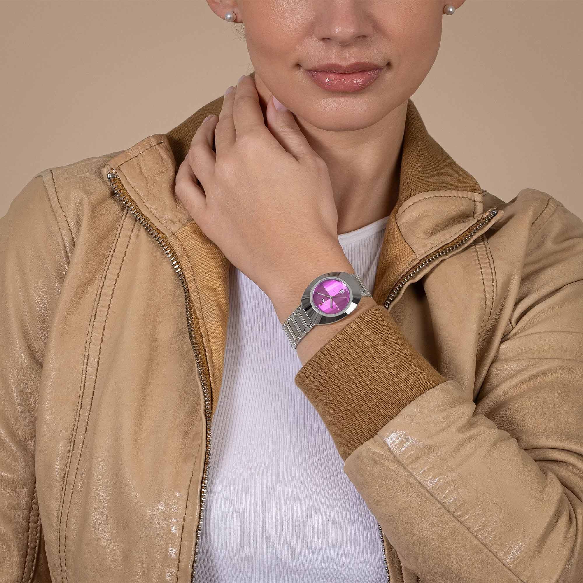 The pink dial adds a touch of elegance while the absence of markers delivers a minimalist aesthetic. Protected by sapphire crystal, the dial remains resistant to scratches, ensuring durability. The analogue display contrasts beautifully with the round stainless steel case, measuring 11mm in depth and finished in a classic silver colour.