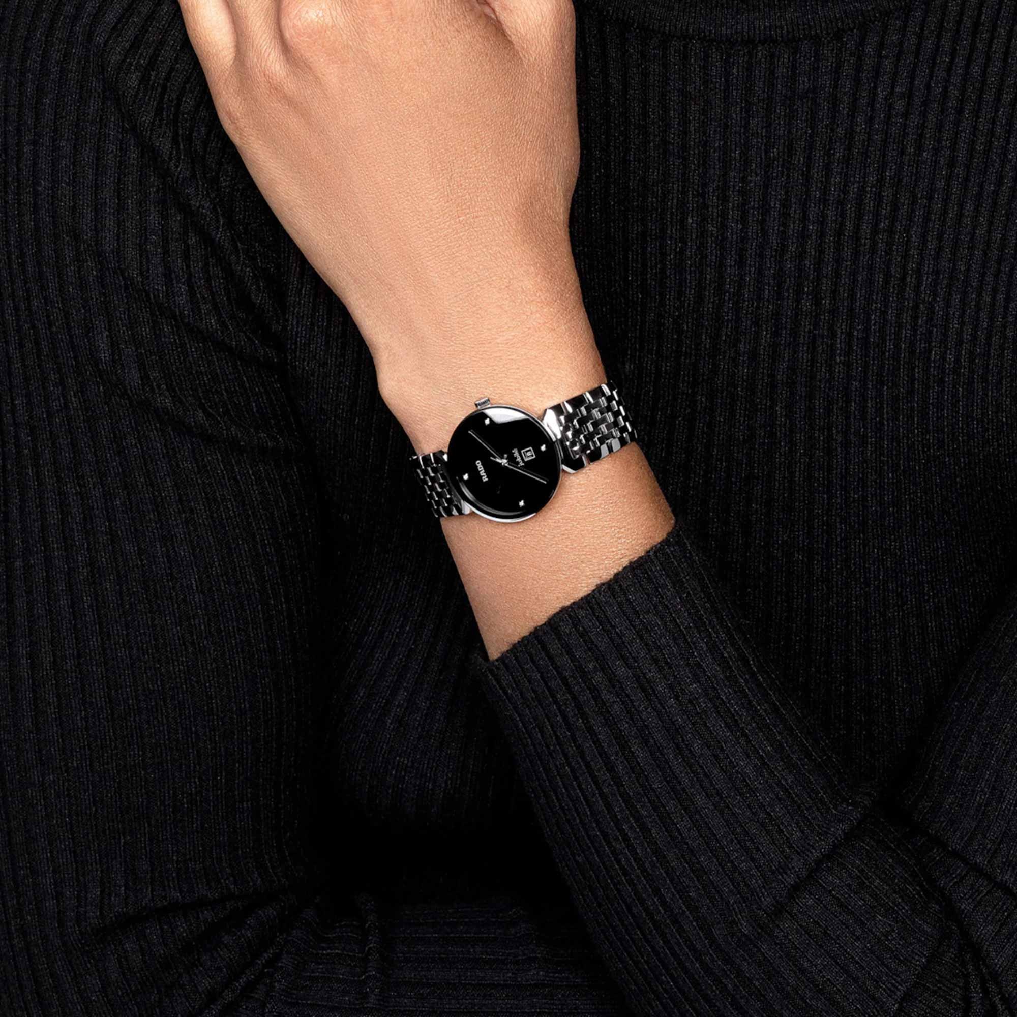 Inspired by Tuscan shadowed streets and soaring domes under the soft evening light, the Rado Florence Ladies Watch R48913713 showcases Rado’s impeccable contemporary design. With a high-quality quartz movement protected by innovative metalized sapphire crystal glass, the black dial has diamonds set at 12, 3, 6 and 9 o’clock. With a 30mm case presented on a stainless steel bracelet and water resistant up to 30 metres, this luxury Swiss timepiece is designed to last forever.