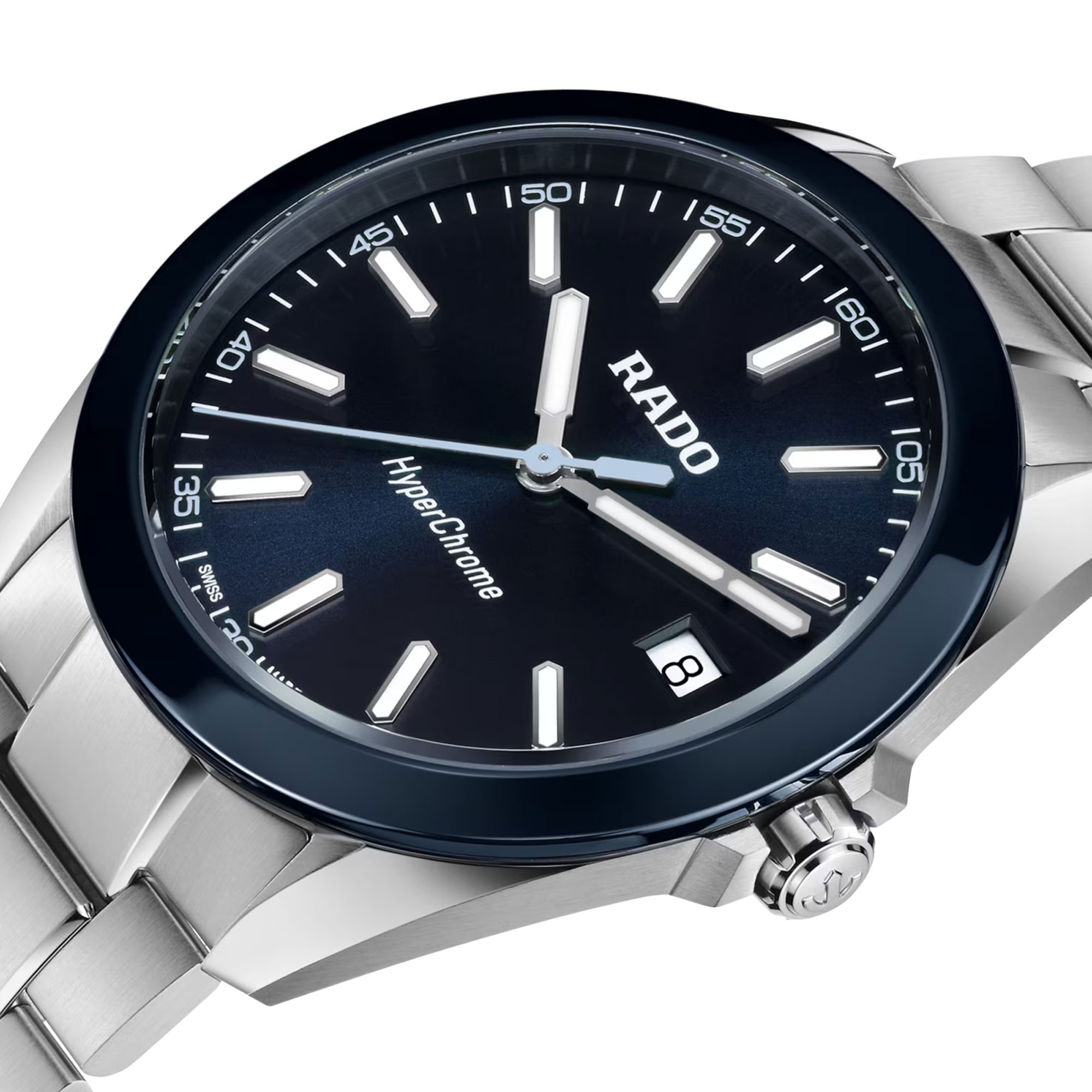 The HyperChrome Quartz is a contemporary expression of precision and material mastery, combining advanced watchmaking technology with a bold and enduring design. The case, sculpted from polished and brushed stainless steel, is encircled by a polished blue high tech ceramic bezel—an elemental combination of strength and refinement. Topping this resilient construction is a curved sapphire crystal with anti-reflective coating on the inner side, offering exceptional scratch resistance and crystal-clear legibility. With water resistance to 15 bar (150 metres), every element of the architecture is designed for lasting precision, durability, and confidence in any setting.