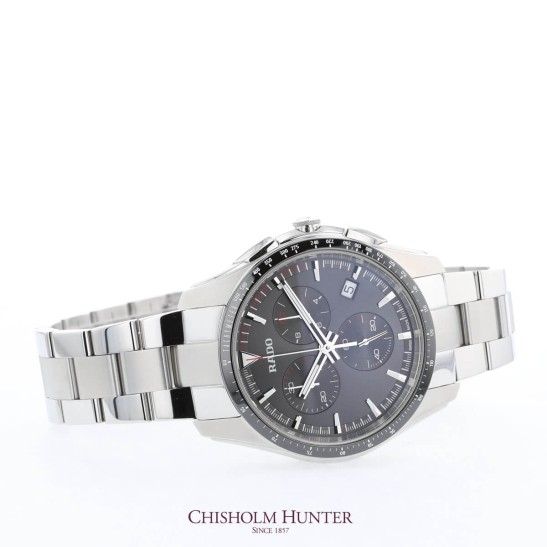 Introducing the Rado Hyper Chrome Collection. Recognisable for its sporty and dynamic features. This model features a masculine, broad, 45mm, stainless steel case with movable, black, tachymeter bezel. The dial is black with white, red and silver accents. Indexes mark the passing hours and minutes clearly along with 3 matching sundials for chronograph feature. A date display window can be found at 4 o’clock. Perfect for the sporty man. All materials have been designed to stand the test of time in Rado watches including the sapphire crystal glass that protects the dial and accurate Swiss quartz movement within. Designed to last forever. An anti-reflective coating has been added for accurate reading. This flawless design is completed with a stainless-steel bracelet with deployment clasp is for easy wear. The bracelet can be adjusted in any of our Chisholm Hunter stores by highly trained staff. This watch is water resistant up to 100 meters. Every Rado timepiece comes with a branded presentable box and a 2-year warranty.