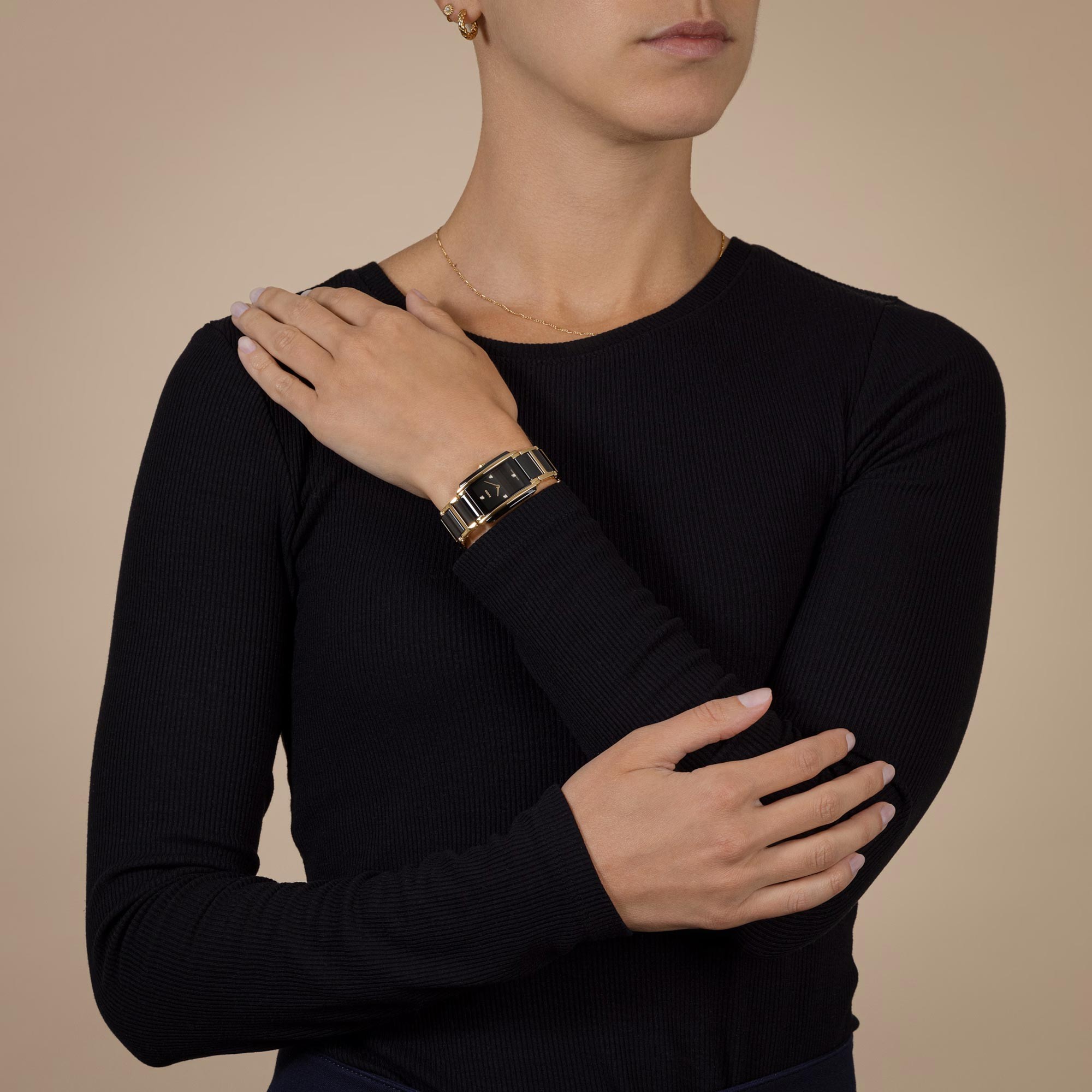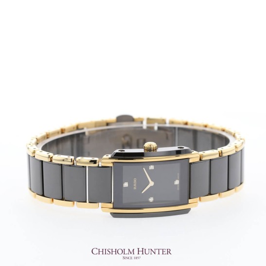 Introducing the Rado Integral collection. Designed for men and women with a passion for innovative watch design. This collection is recognisable for its sleek, rectangular dial. This addition to the collection features an elegant 22mmx33mm black ceramic case. The dial is chic in matching black, with yellow gold detailing. Sparkling diamonds are set to mark 12, 3,6 and 9 o’clock along with yellow gold clock hands. This is all powered by an accurate Swiss quartz movement housed within the watch. All materials have been designed to stand the test of time with Rado watches including the sapphire crystal glass that protects the dial and movement within. Designed to be beautiful forever. The linear look is completed by a high-tech black ceramic and PVD yellow gold bracelet. A deployment clasp makes this watch so easy to wear day or night. The bracelet can be adjusted in any of our Chisholm Hunter stores. This watch is water resistant up to 50 meters. Every Rado timepiece comes with a branded presentable box and a 2-year international warranty.