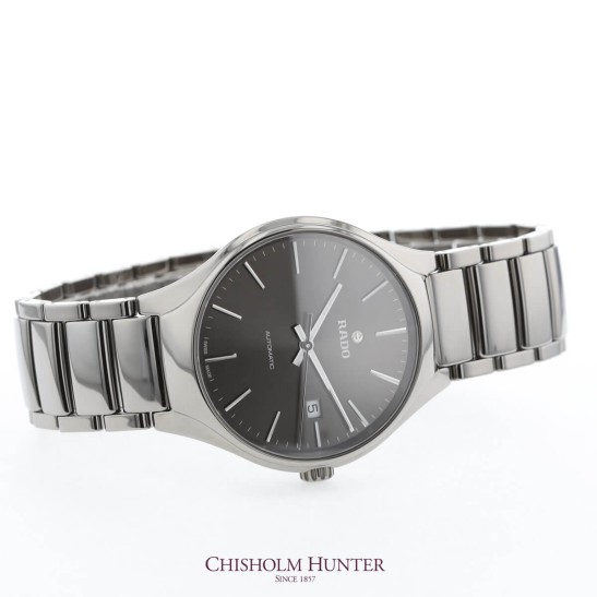 The Rado True collection is recognisable for its curved, sleek casing with classic, minimalist dial. This addition to the collection boasts a 40mm case made from innovative grey plasma ceramic. The dial looks contemporary in matching grey with silver batons and clock hands marking the passing hours. A date display feature can be found at 3 o’clock with highly revered rocking anchor at 12 o’clock. Found in all Rado watches powered by a sophisticated Swiss automatic movement. All materials have been designed to stand the test of time in Rado watches including the sapphire crystal glass that protects the dial and sophisticated Swiss automatic movement within. Designed to be last forever. The modern look is completed by a matching high-tech plasma ceramic bracelet. This material is scratch resistant and cutting edge in watch design. A deployment clasp is fitting for easy wear for the modern man. The bracelet can be adjusted in any of our Chisholm Hunter stores by highly trained staff. This watch is water resistant up to 50 meters. Every Rado timepiece comes with a branded presentable box and a 2-year warranty.