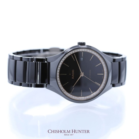 The Rado True collection is recognisable for its curved, sleek casing with classic, minimalist dial. This addition to the collection boasts a 40mm high tech black ceramic case and contemporary, matching dial. Rose gold batons mark each hour as the dial is surrounded by a circle of sparkling diamonds. More rose gold detail can be found on the clock hands and iconic, rocking anchor found on all Rado watches powered by a sophisticated Swiss automatic movement. This timepiece also features a date display located at 3 o’clock. All materials have been designed to stand the test of time in Rado watches including the sapphire crystal glass that protects the dial and movement within. Designed to be beautiful forever. This innovated design is completed by a scratch resistant black ceramic bracelet with concealed clasp. The bracelet can be adjusted in any of our Chisholm Hunter stores by highly trained staff. This watch is water resistant up to 50 meters. Every Rado timepiece comes with a branded presentable box and a 2-year warranty.
