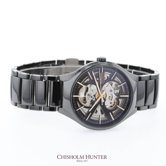The Rado True collection is recognisable for its curved, sleek casing with classic, minimalist dial. This addition to the collection boasts a 40mm high tech black ceramic case and breath-taking, black, skeleton dial. Known as an open-heart design in Rado watches. Yellow gold and white detail batons mark each hour along with matching clock hands. More gold detail can be found on iconic, rocking anchor on all Rado watches powered by a sophisticated Swiss automatic movement. Admire the beauty of the complex movement through this unique skeleton face and through the back casing. All materials have been designed to stand the test of time in Rado watches including the sapphire crystal glass that protects the dial and movement within. Designed to be beautiful forever. This innovated design is completed by a scratch resistant black ceramic bracelet with concealed clasp. The bracelet can be adjusted in any of our Chisholm Hunter stores by highly trained staff. This watch is water resistant up to 50 meters. Every Rado timepiece comes with a branded presentable box and a 2-year warranty.