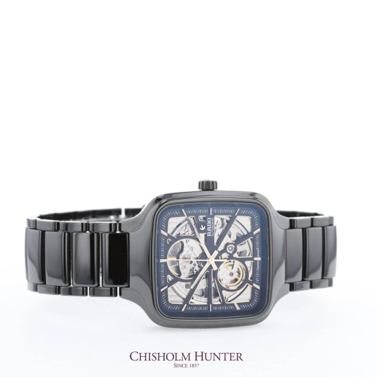 The Rado True collection is recognisable for its curved, sleek casing with classic, minimalist dial. This addition to the collection boasts a 38mm square, high tech, black ceramic case and incredible skeleton dial. Rose gold and white accent batons mark the passing hours along with matching clock hands. Admire the beauty of the intricate Swiss automatic movement in all its glory through this skeleton dial. All materials have been designed to stand the test of time in Rado watches including the sapphire crystal glass that protects the dial and movement within. Designed to last forever. This innovated design is completed by a scratch resistant, high tech, black ceramic bracelet with concealed clasp. The bracelet can be adjusted in any of our Chisholm Hunter stores by highly trained staff. This watch is water resistant up to 50 meters and has an impressive power reserve of up to 80 hours. Every Rado timepiece comes with a branded presentable box and a 2-year warranty.
